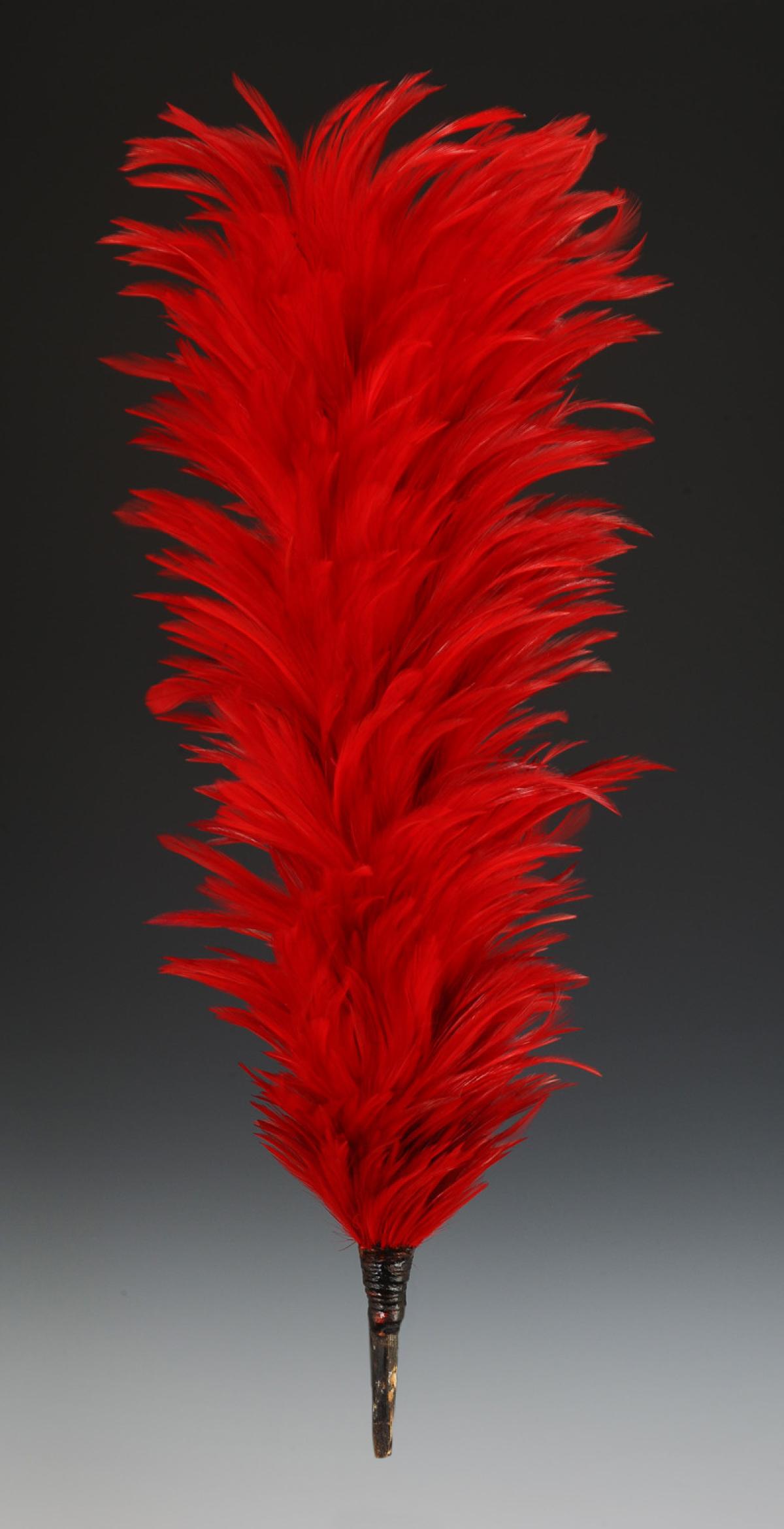 En plumes de coq teintées écarlates, H 38 cm, montées sur une baleine en bois, H totale 45,5 cm.