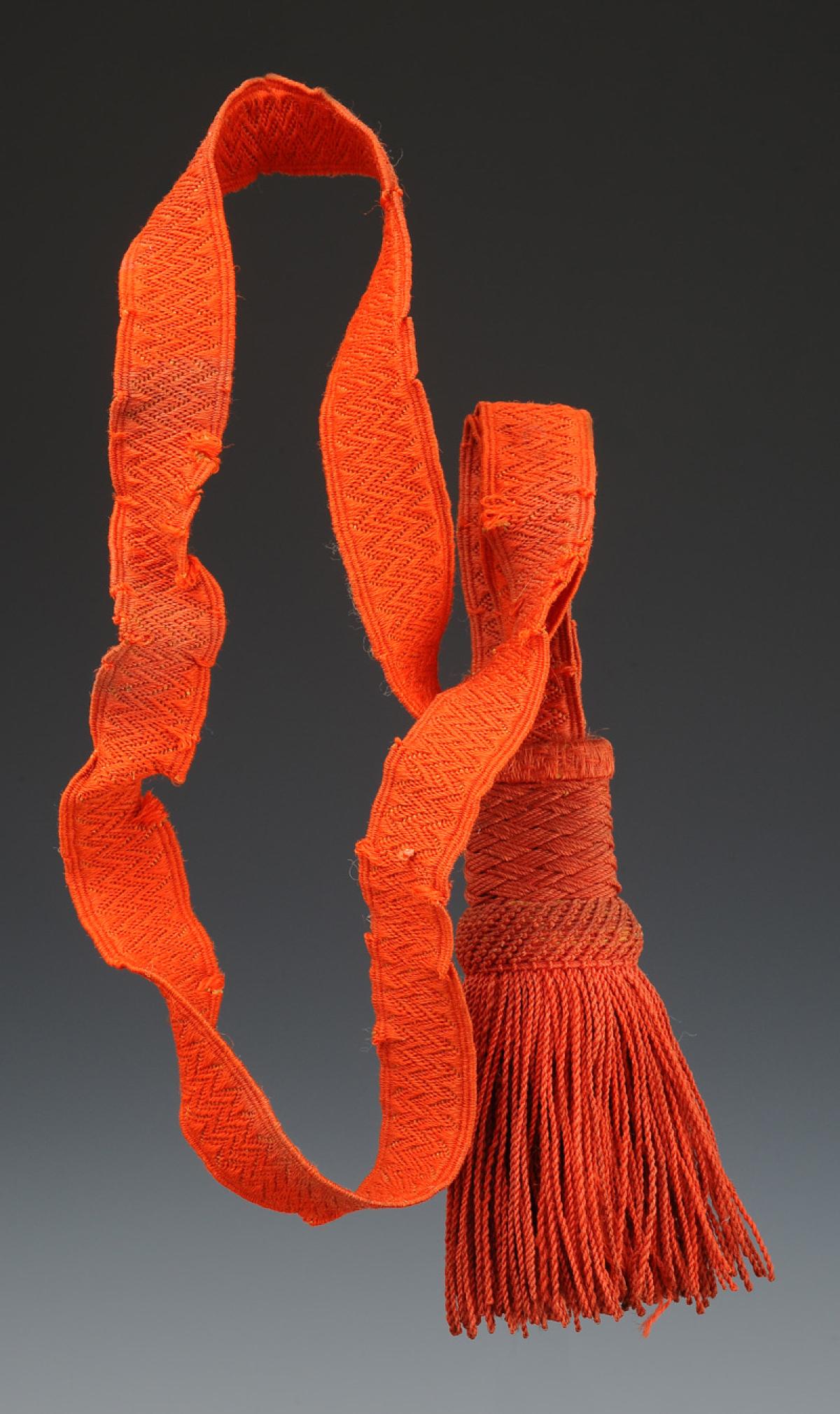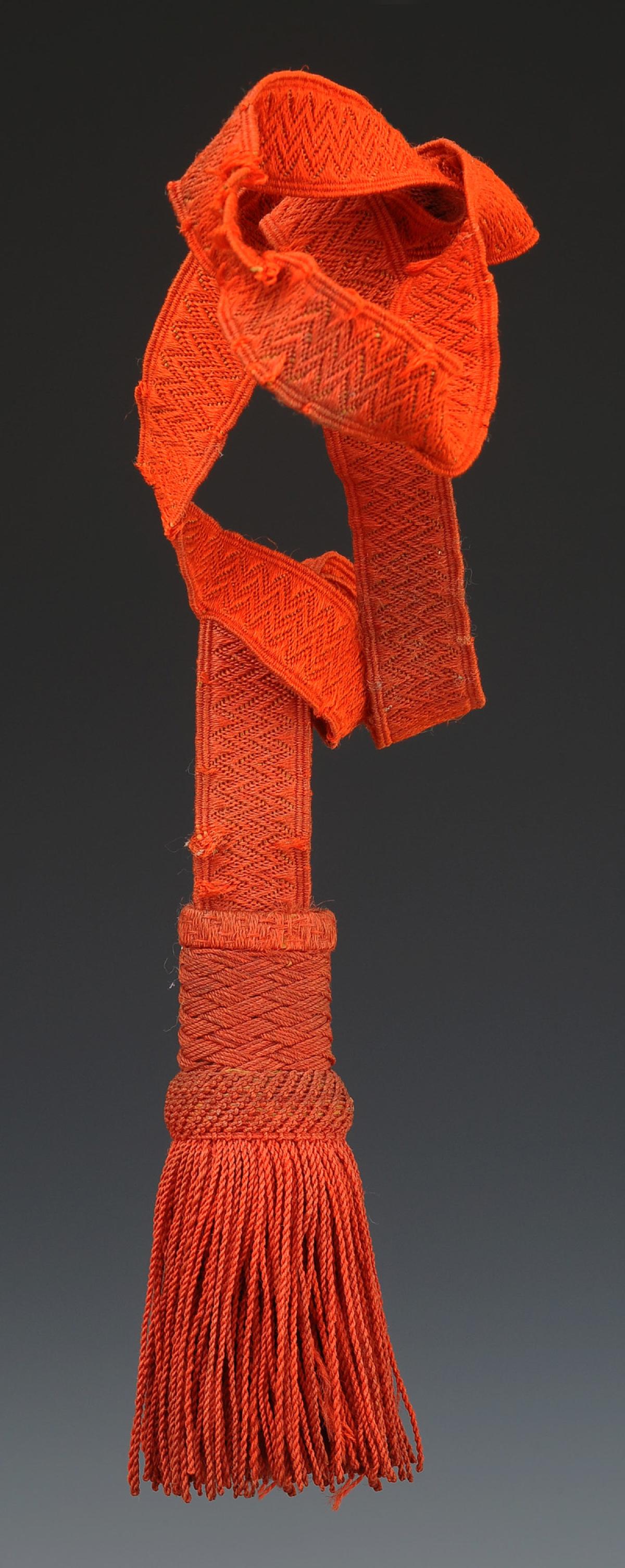 Dragonne entièrement en passementerie écarlate composée d'un cordon tissé « lézard » plié en deux, longueur 38 cm, terminée par un gland à franges souples. Longueur totale 49 cm.