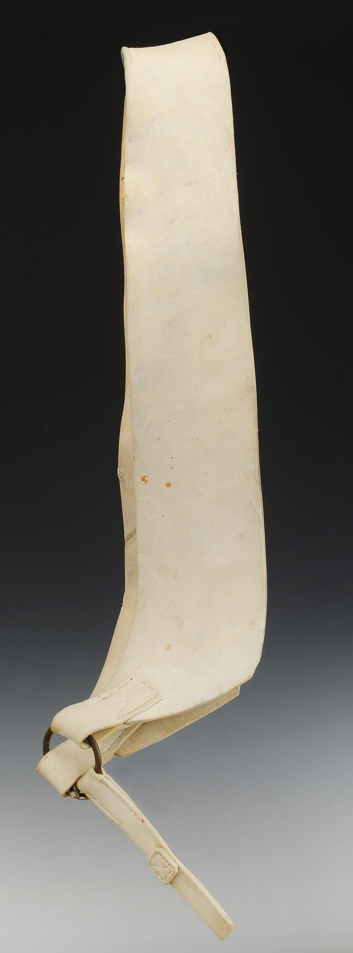 Baudrier en buffle blanchi, largeur 11 cm, coupé en biais en partie basse ; les deux parties sont reliées entre elles par un anneau de laiton, Ø 5 cm, l'anneau passant dans deux pattes fixées au bas du baudrier. Patte de suspension pour le tambour en buffle blanchi, H 15,5 cm, fixée à l'anneau.