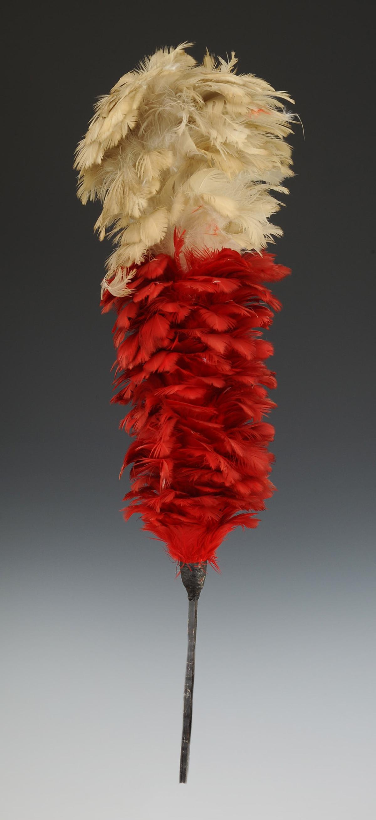 En plumes de coq écarlates, H 25 cm, dont un sommet en plumes blanches de 9 cm., montées sur un fanon de baleine, H totale 37 cm.