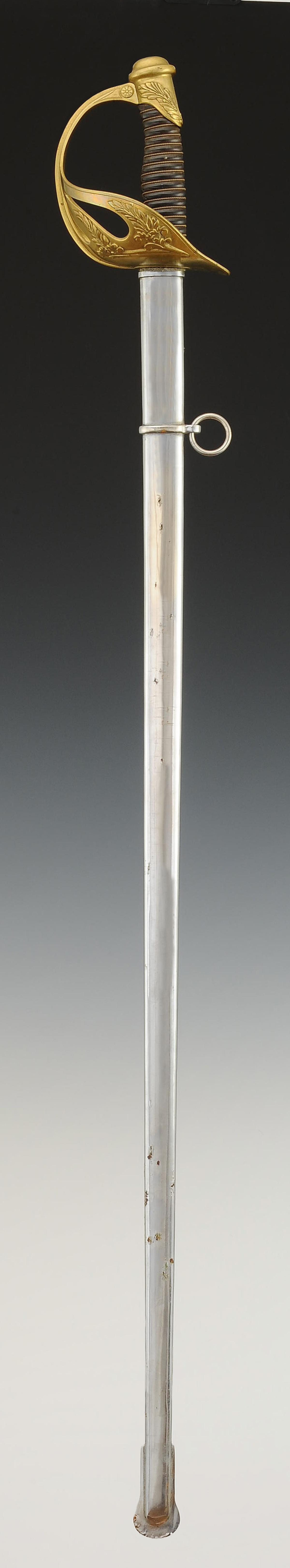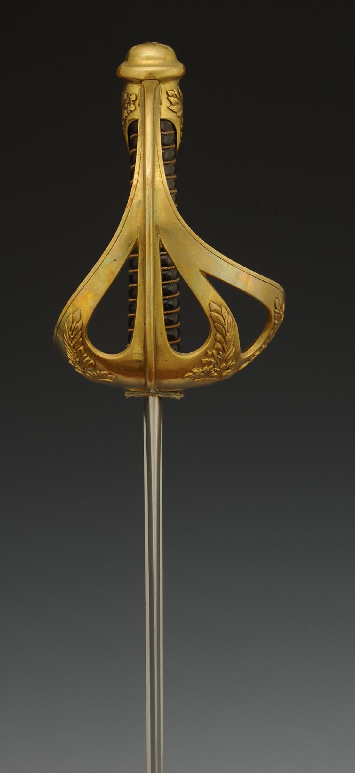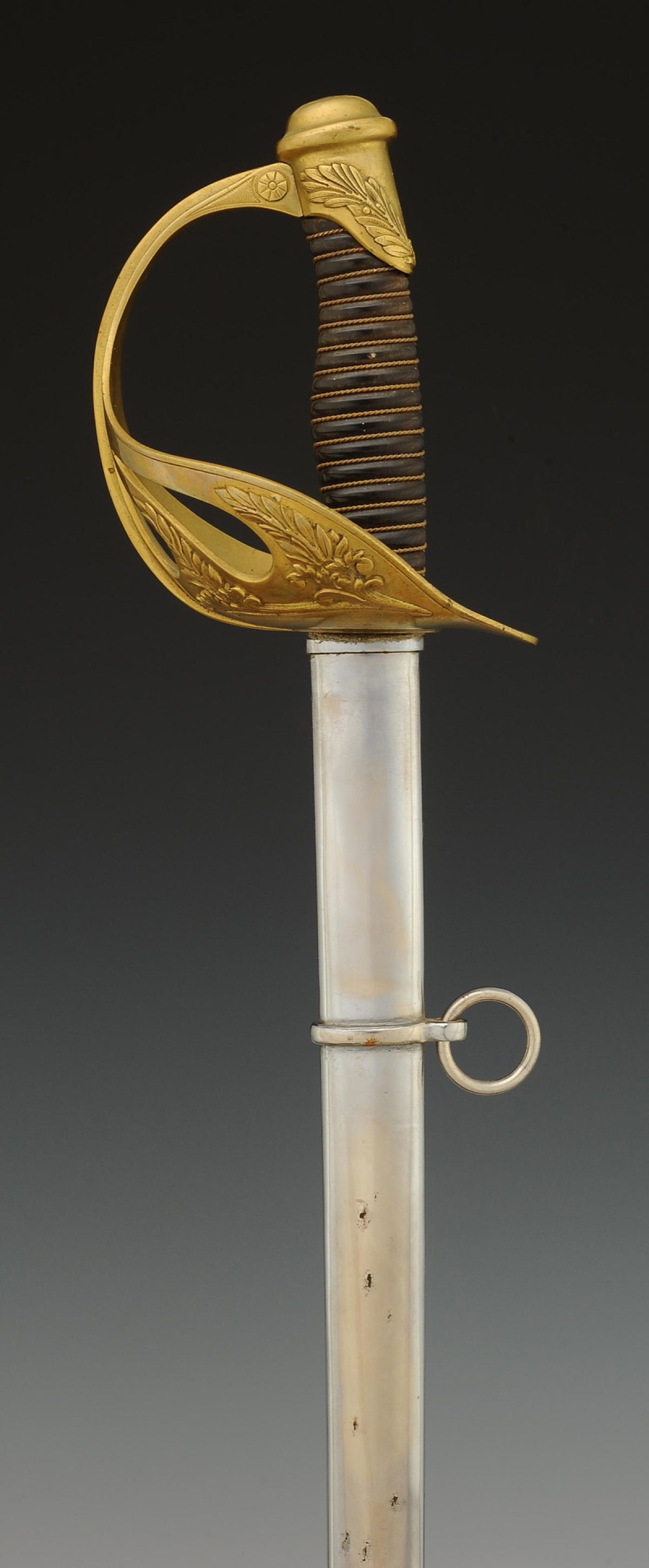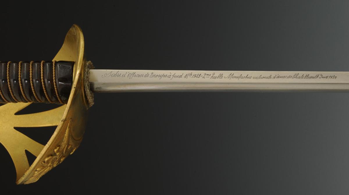 Monture en laiton. Garde à quatre branches formant coquille et décorées de rameaux de laurier. Calotte à courte queue. Poignée en ébène filigrané cuivre. Cravate en feutre blanc. Lame droite nickelée à gouttières, longueur 85,2 cm, signée au dos « Sabre d'officier de troupes à pied mle 1923 2me taille Manufacture nationale d'armes de Chatellerault juin 1930 ». Fourreau en tôle d'acier nickelé à un bracelet de bélière, dard en forme de lyre.