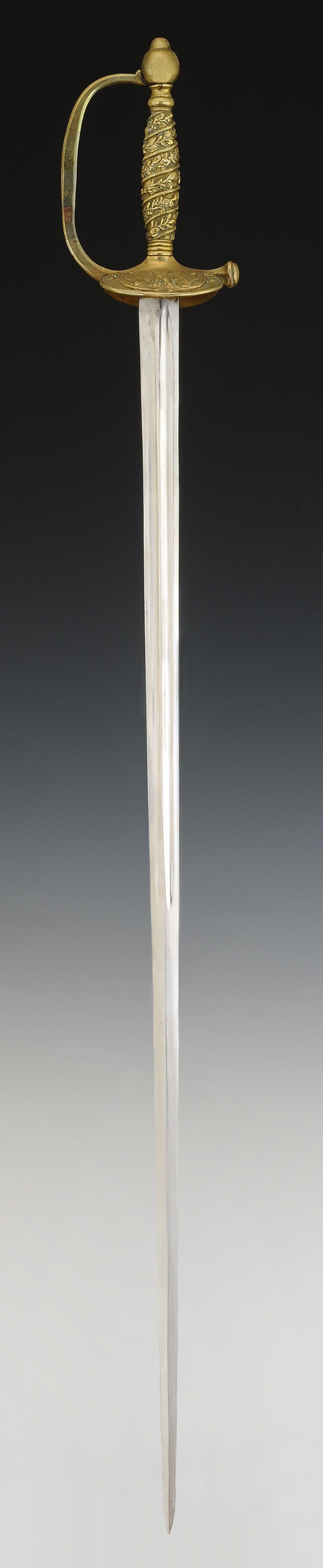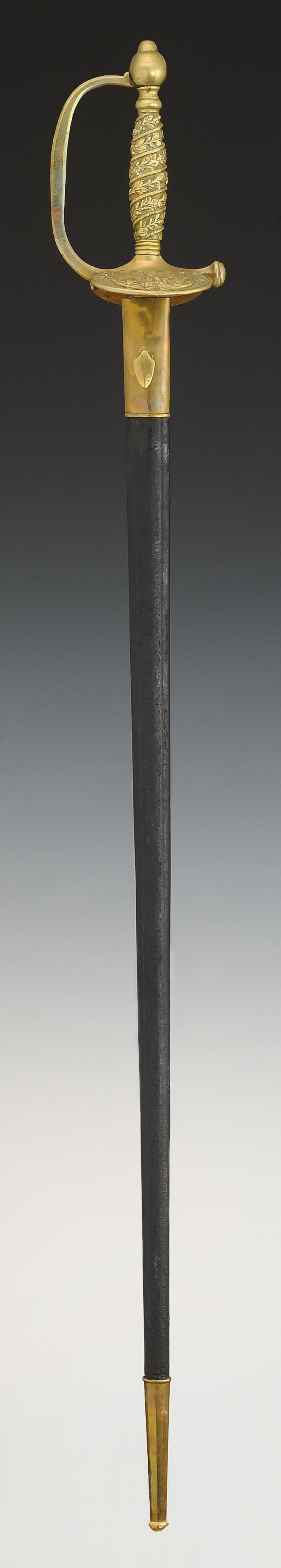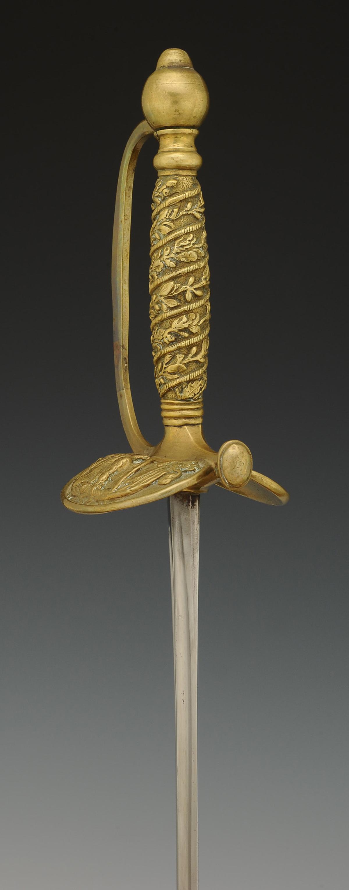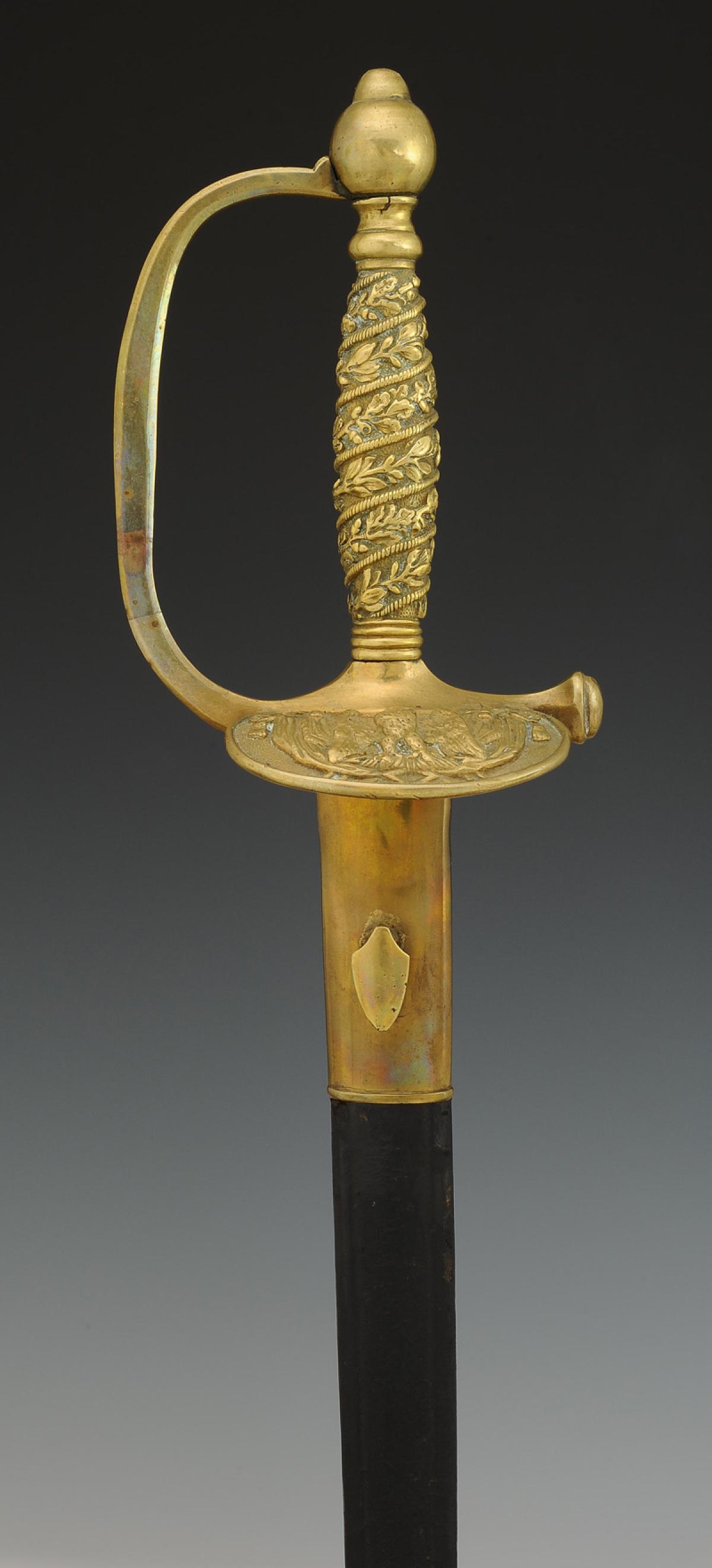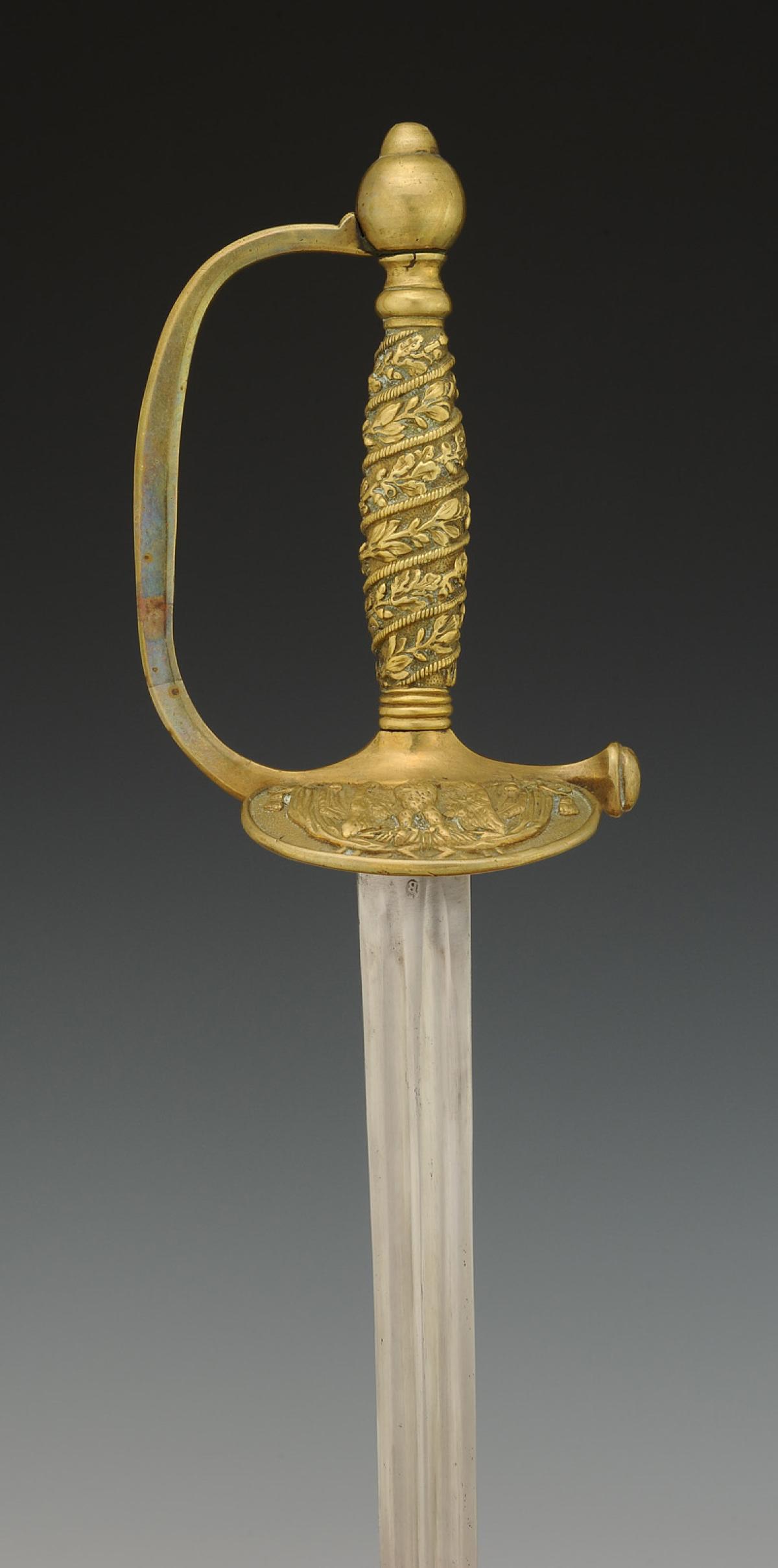 Monture en laiton. Garde à une branche. Clavier moulé en relief d'une aigle impériale posée sur un faisceau de drapeaux. Contre-clavier pliant. Pommeau uni de forme ronde. Poignée en laiton moulé de branches de chêne et de laurier s'enroulant vers le haut. Cravate en cuir naturel. Lame droite à gouttières et pans creux, longueur 81 cm. Fourreau en cuir verni noir à deux garnitures de laiton, bout du fourreau terminé par une bouterolle en laiton, chape avec bouton pour le port au ceinturon en forme d'écu uni.