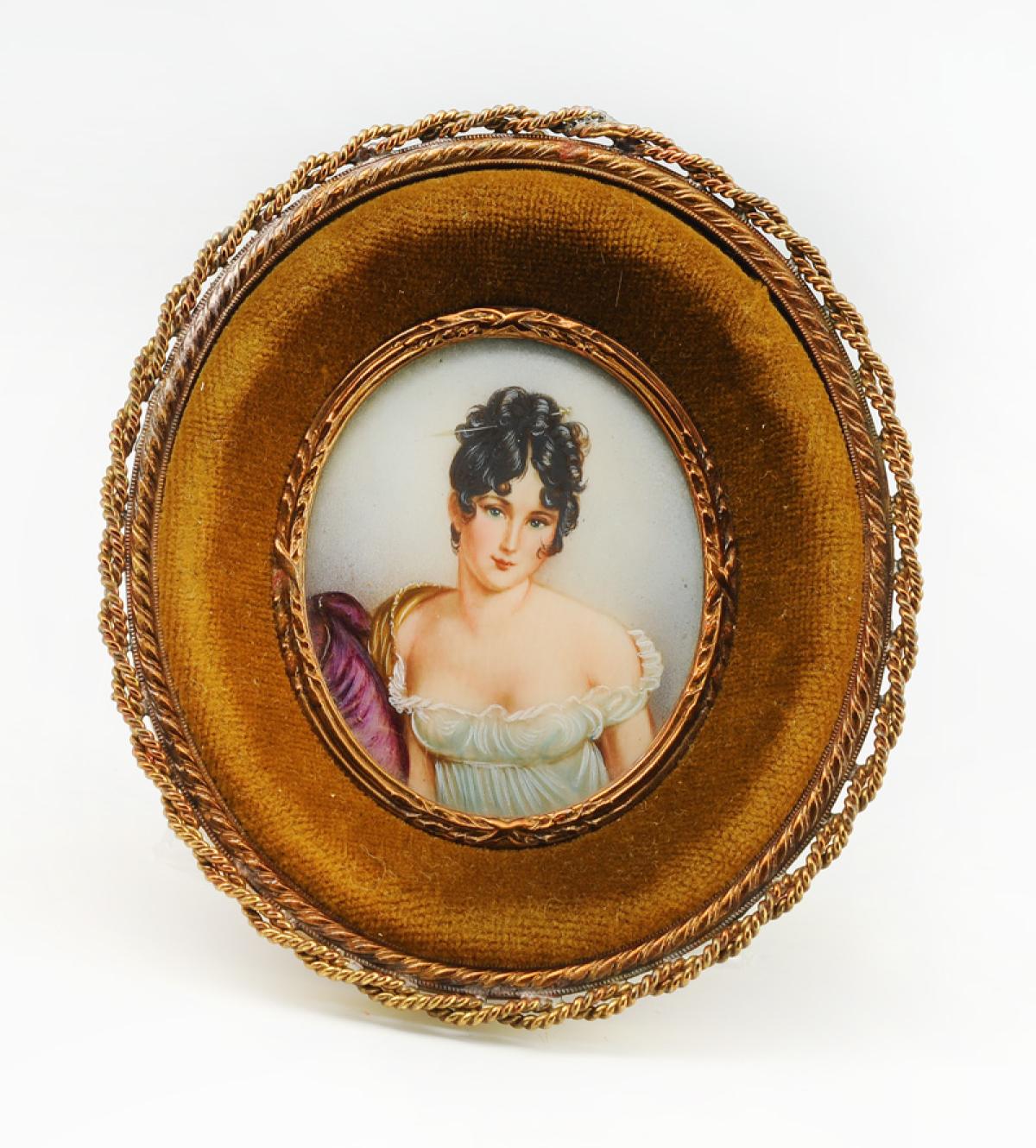 De forme ovale. H à vue 6 cm x 5 cm. Présenté sous verre dans un cadre en laiton et velours, H 11,5 cm x 10 cm.