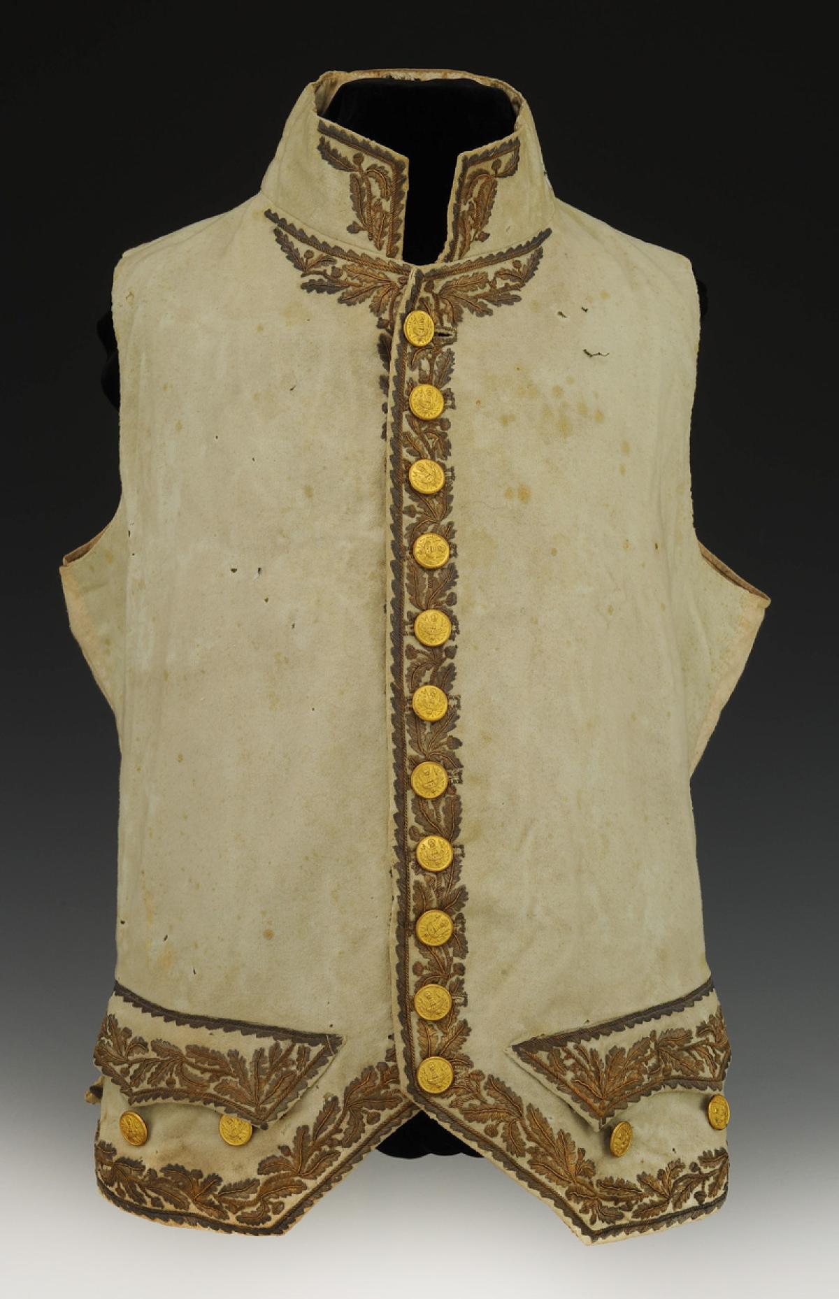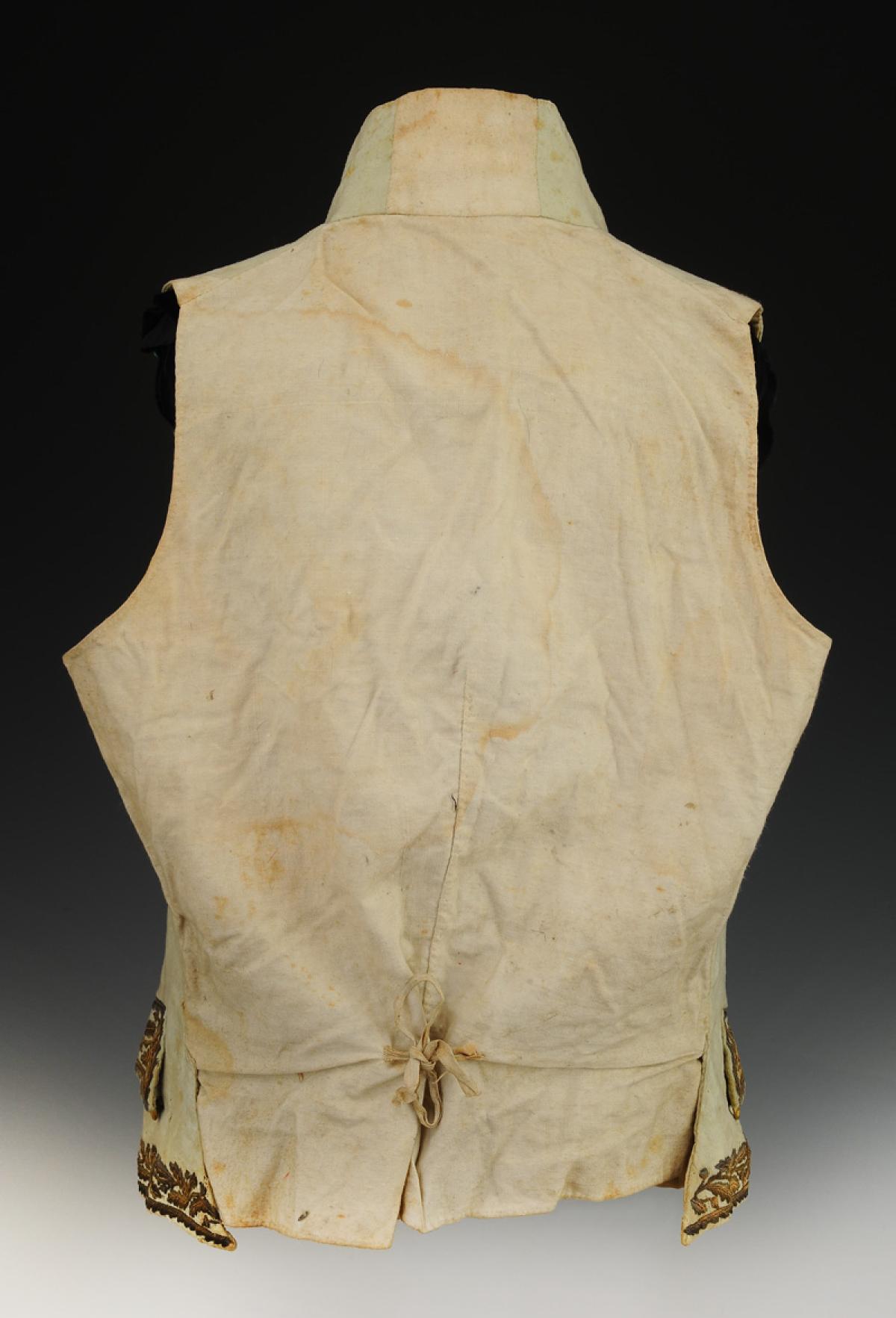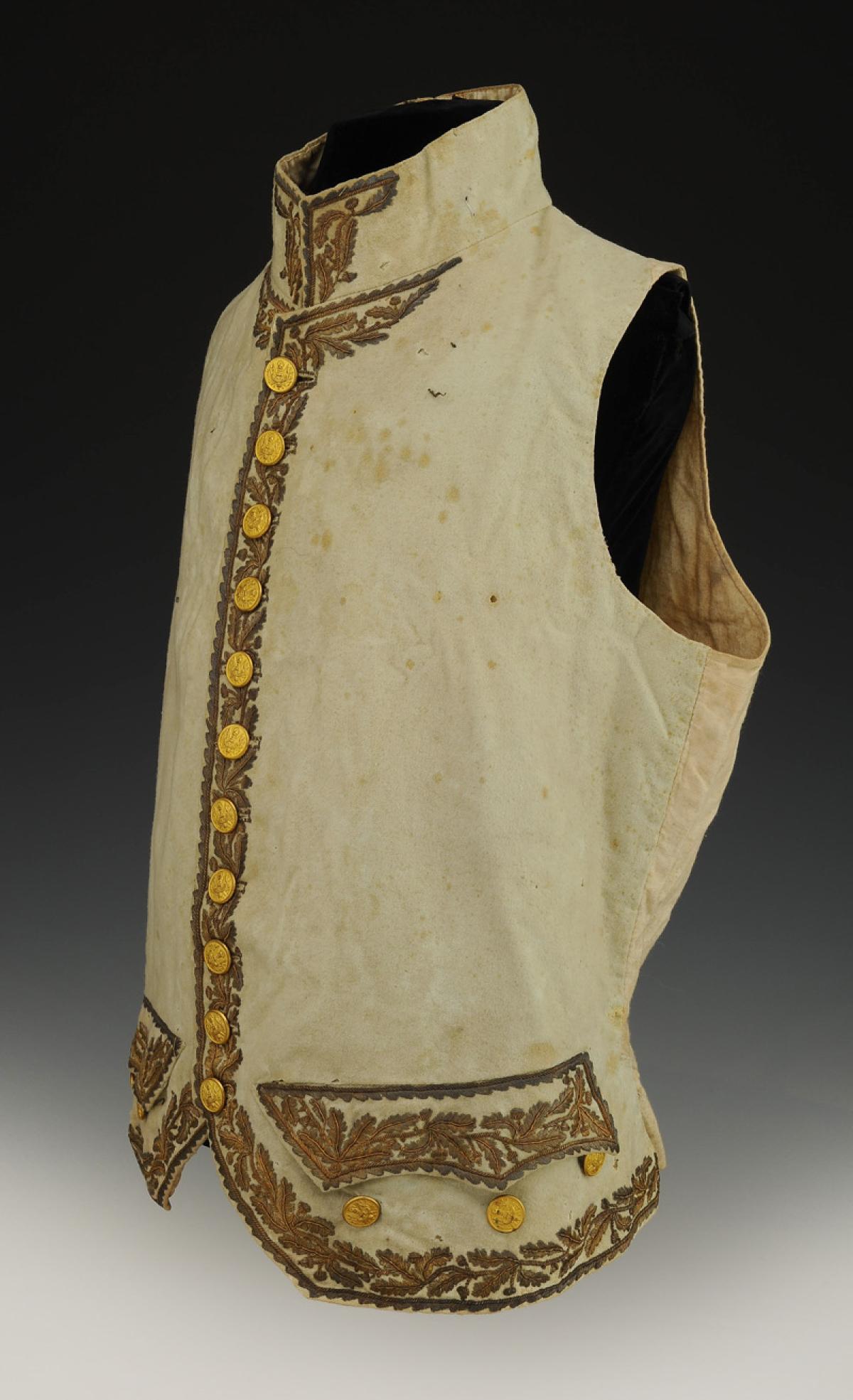 Ce gilet est d'un modèle de transition entre les réglements de Vendemiaire an VII et Vendemiaire An XII. Le réglement de Vendemiaire An VII prévoit un gilet croisé à l'avant à douze boutonnières. Le réglement de Vendemiaire an XII décrit un gilet droit à neuf boutonnières.