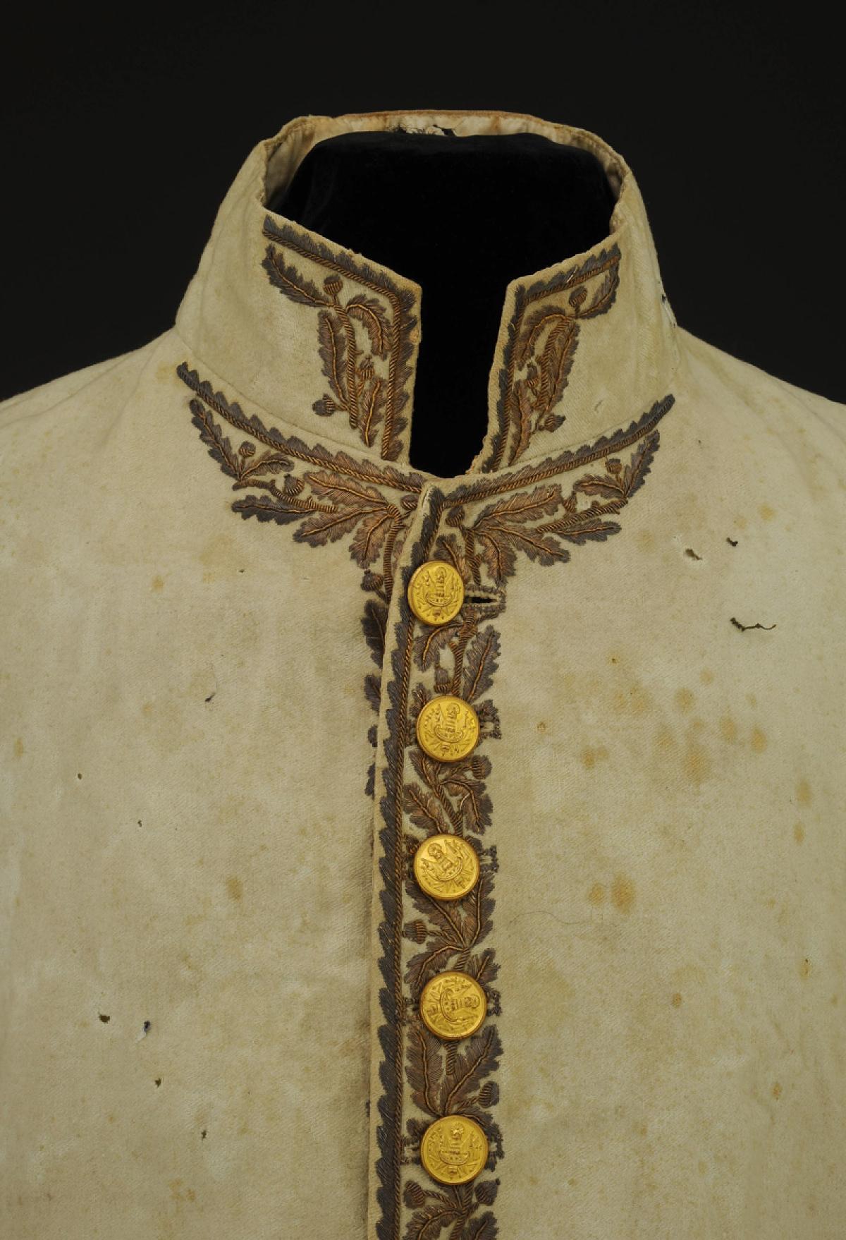 Gilet en drap blanc, brodé sur le devant, le collet, la patte et le contour des poches, d'une baguette festonnée et d'une branche de feuilles de chêne, en fils et cannetilles d'argent doré. Largeur de la broderie y compris de la baguette 3,4 cm.