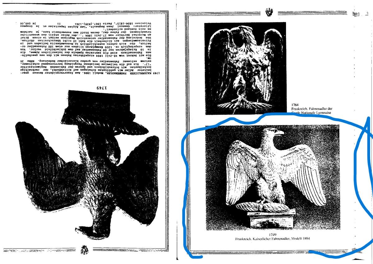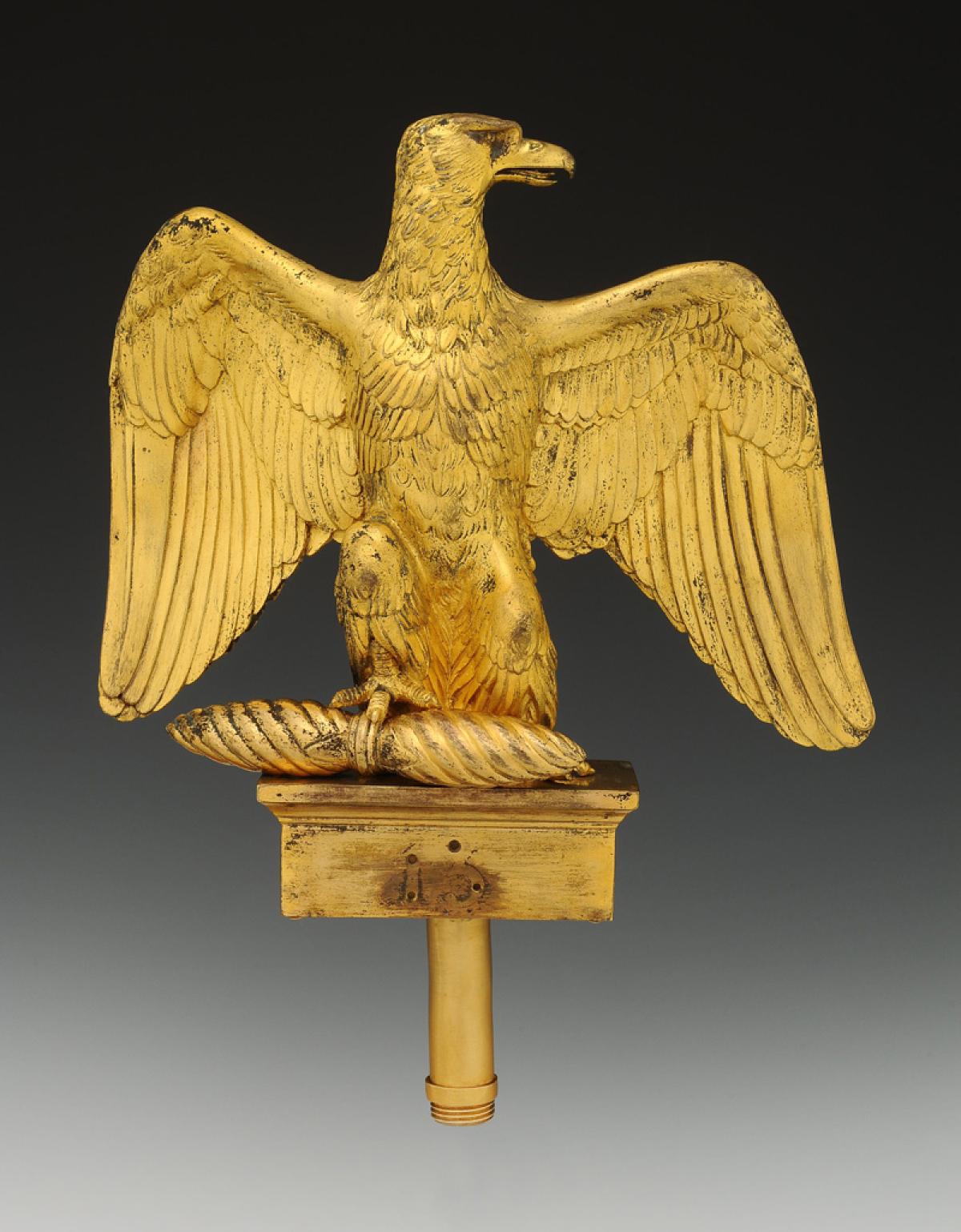 Aigle en bronze doré à l’or moulu, exécutée par Thomire, d’après une œuvre originale de Chaudet. En 1804-1805 une aigle coûte 145 francs français. L’Aigle à la tête dirigée vers la droite, les ailes légèrement déployées, la serre gauche tenant un fuseau de Jupiter sans éclair. L’Aigle repose sur un socle en forme de caisson portant à l’origine le numéro du régiment à l’avers et au revers.