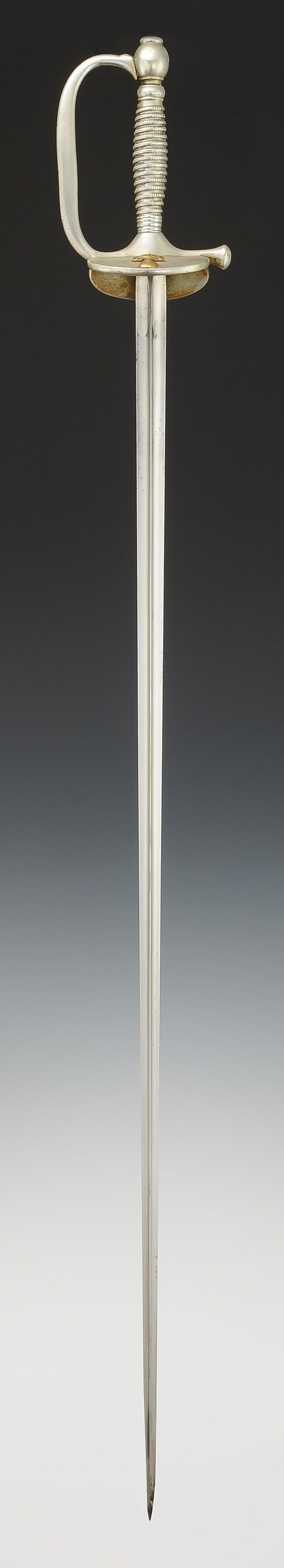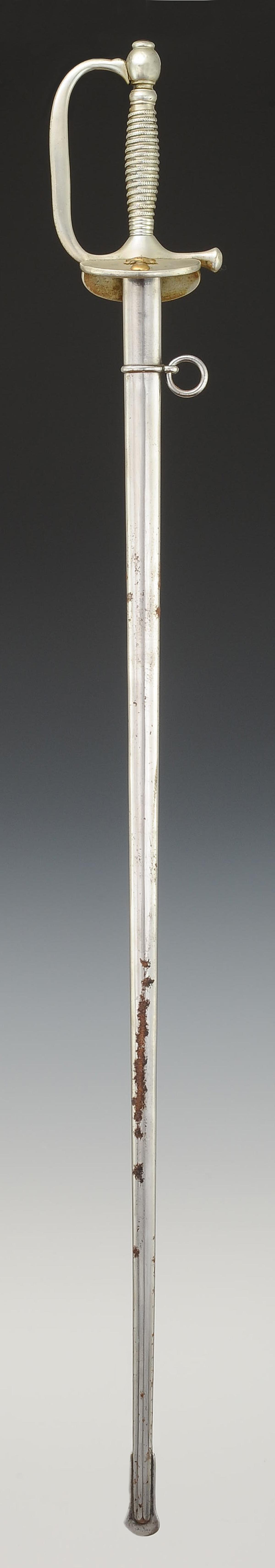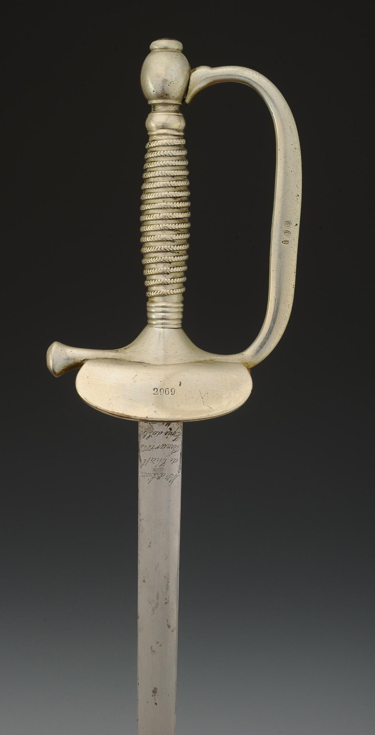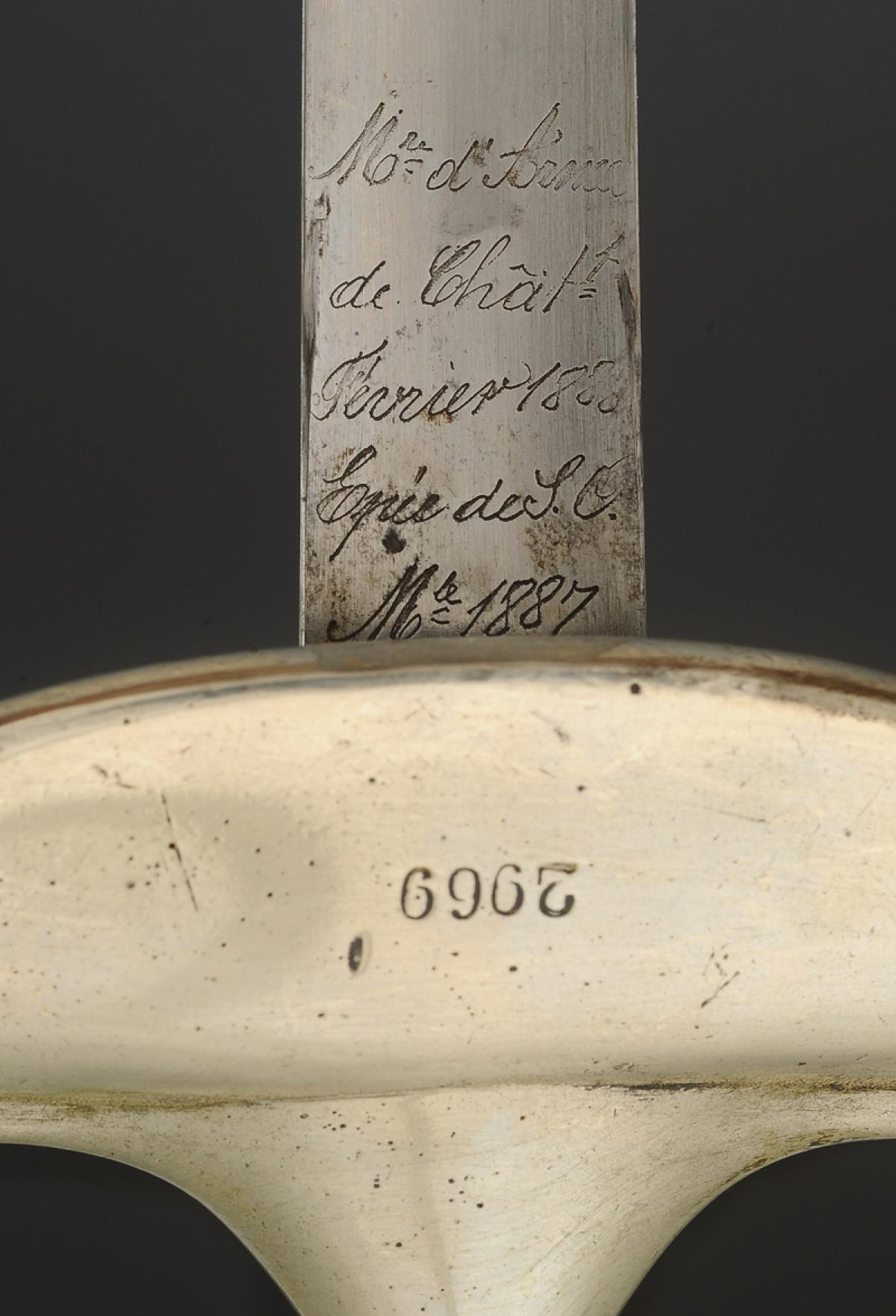 Monture en acier poli. Garde à branche lisse. Clavier bivalve décoré d'une grenade en laiton rapportée et rivetée. Contre-clavier fixe, matriculé « 2969 ». Pommeau rond, viroles décorées aux traits. Poignée en métal blanc poli. Lame triangulaire en acier poli, longueur 80,8 cm, signée au talon « Mre d'Armes / de Châtt / Février 1888 Epées de S.O. / Mle 1887 ». Fourreau en acier poli à un bracelet de bélière, dard découpé en forme de lyre.