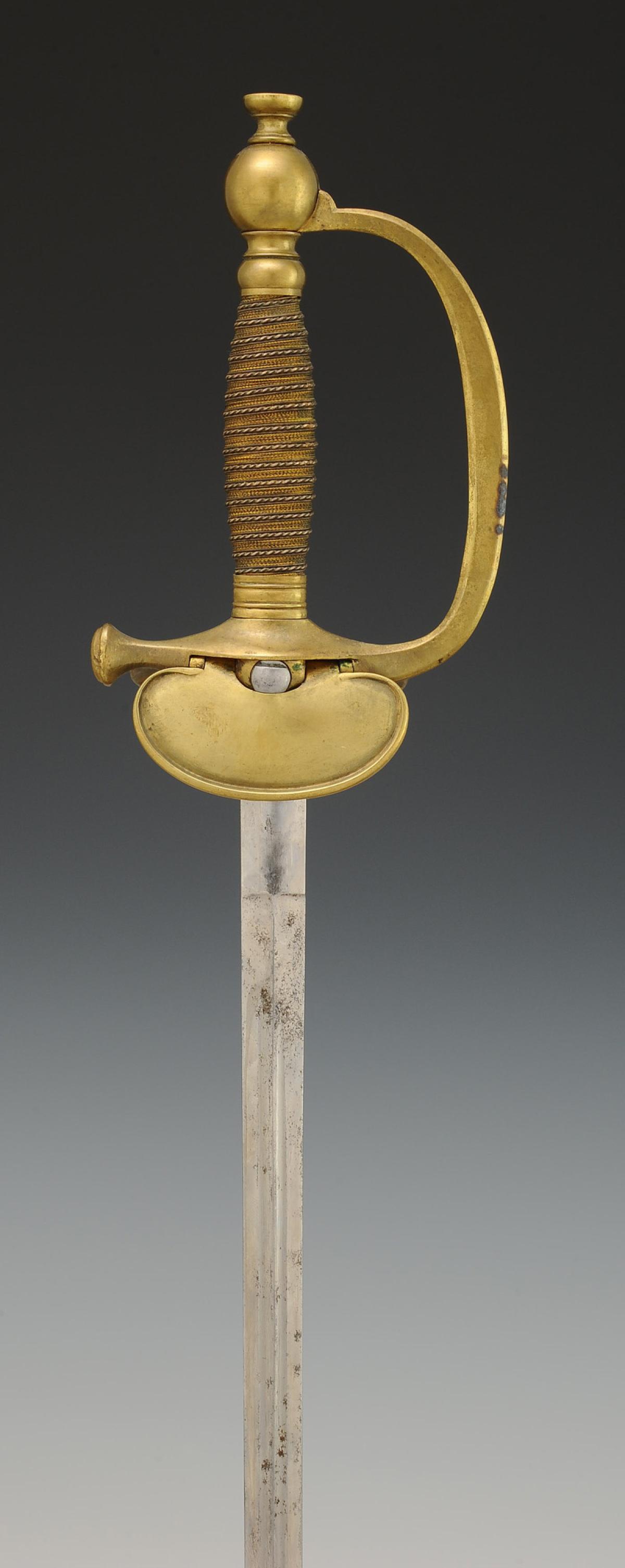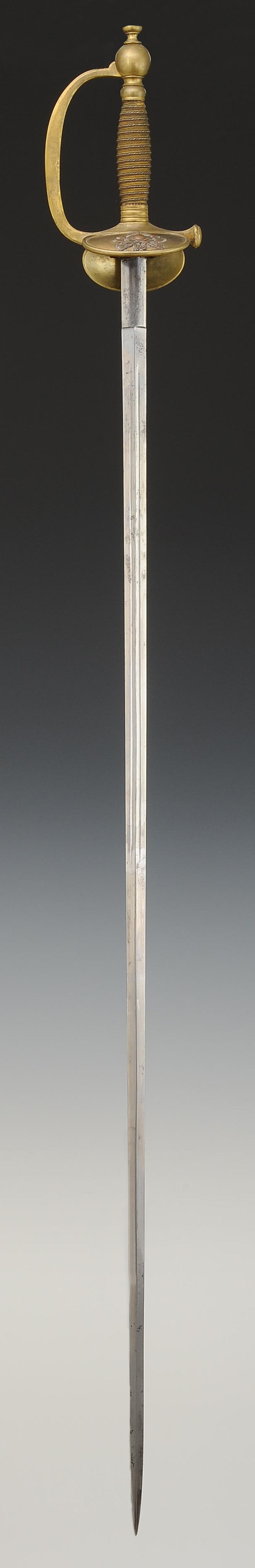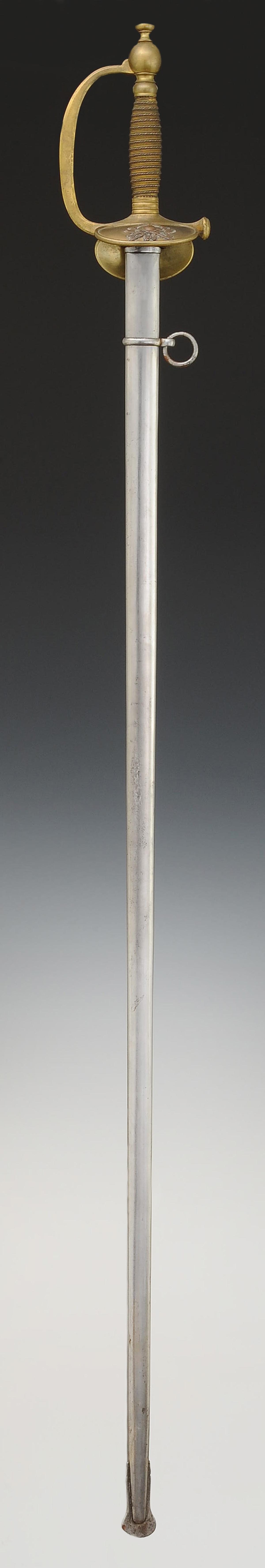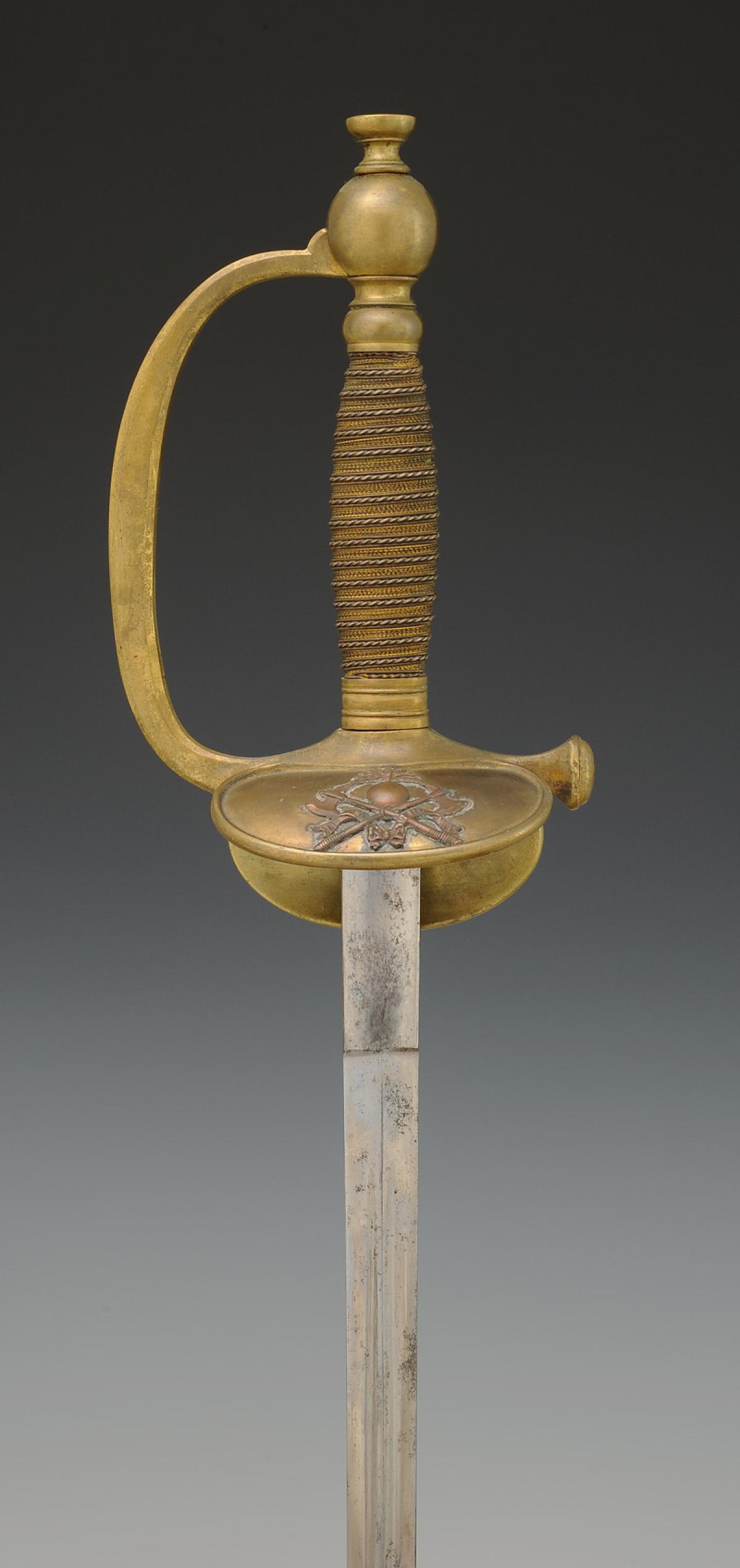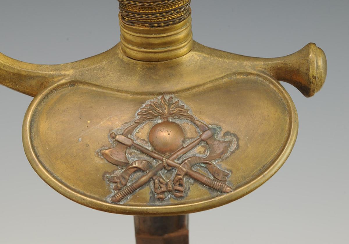 Monture en laiton. Garde à branche lisse. Clavier bivalve décoré de deux haches croisées et d'une bombe enflammée en cuivre, rapportées et rivetées. Contre-clavier ployant. Pommeau rond, viroles décorées aux traits. Poignée en bois entièrement filigrané de cuivre argenté et de cuivre. Cravate en cuir naturel. Lame à gouttières et arête centrale, longueur 91 cm. Fourreau en acier poli à un bracelet de bélière, dard découpé en forme de lyre.