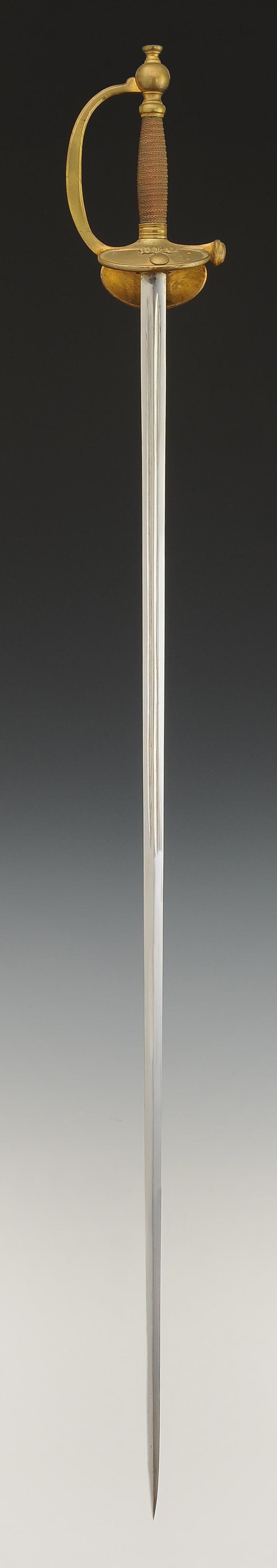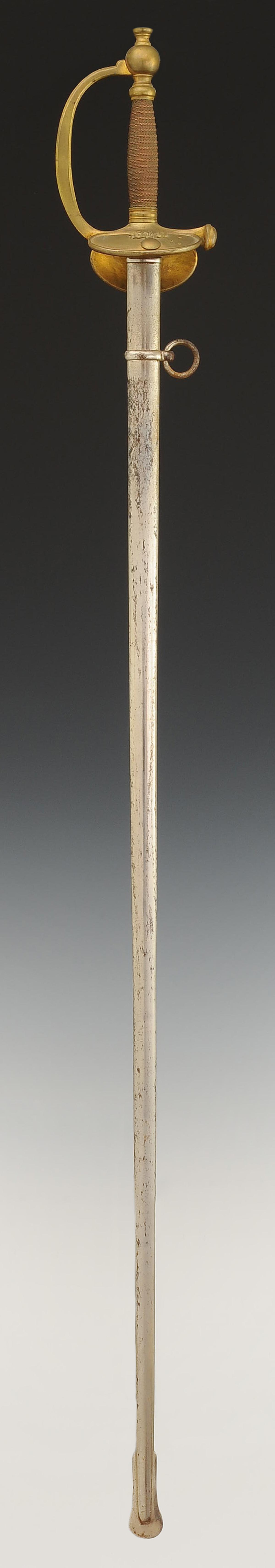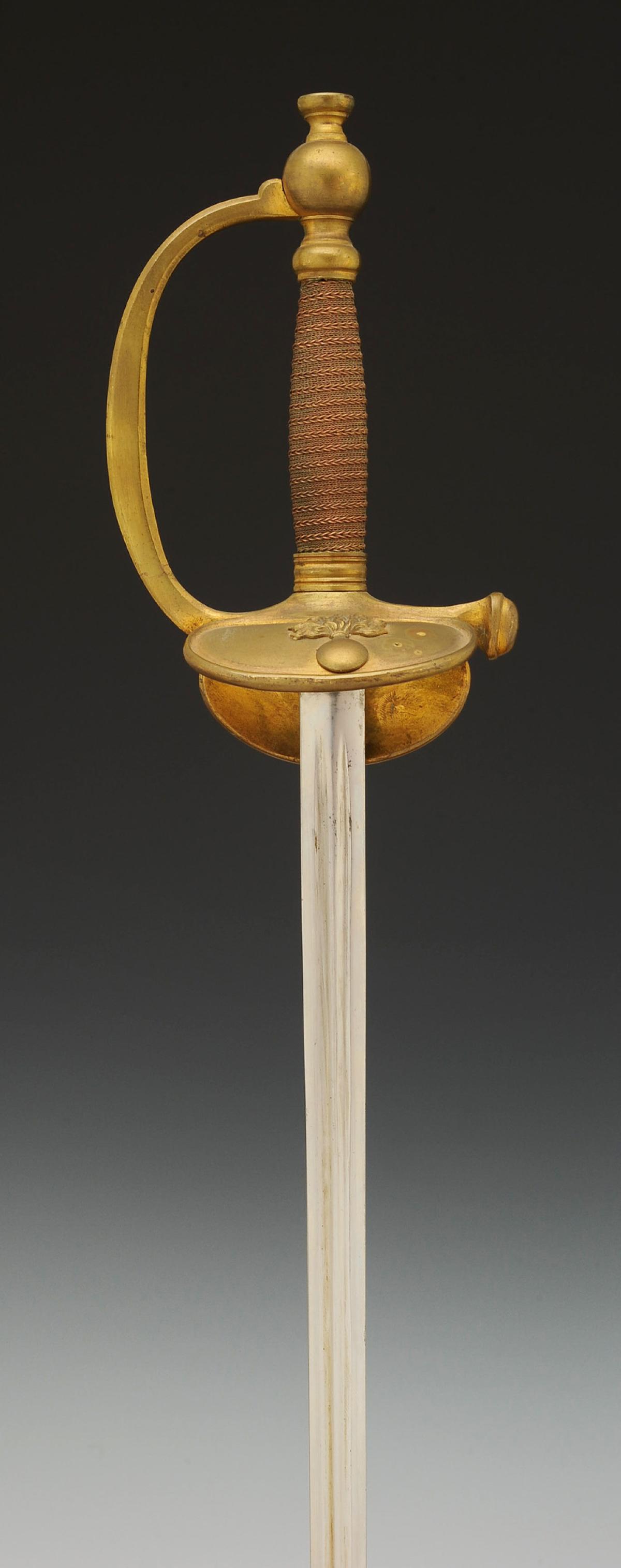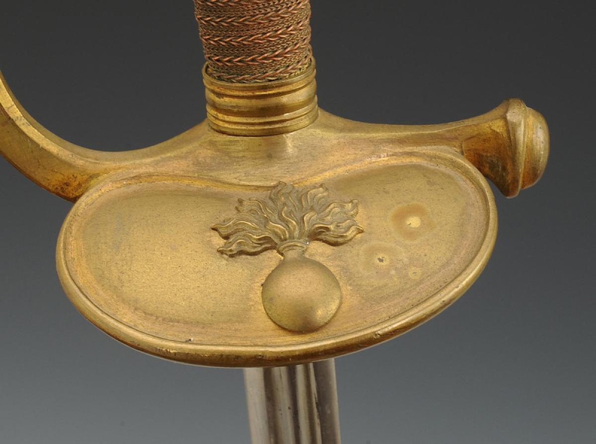 Monture en laiton doré. Garde à branche lisse. Clavier bivalve décoré d'une grenade en laiton doré rapportée et rivetée. Contre-clavier ployant. Pommeau rond, viroles décorées aux traits. Poignée en bois entièrement filigrané de cuivre. Cravate en cuir naturel. Lame à gouttières et arête centrale, longueur 88,5 cm. Fourreau en acier nickelé à un bracelet de bélière, dard découpé en forme de lyre.