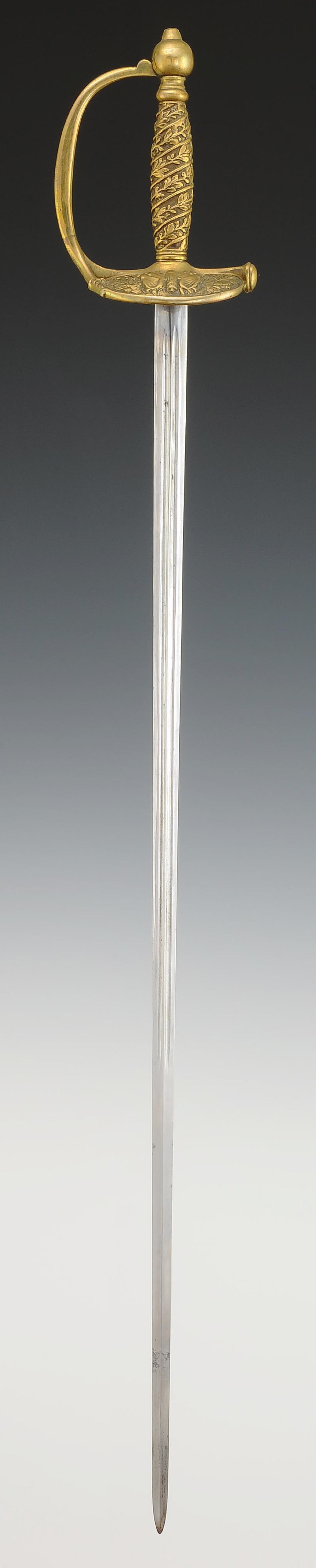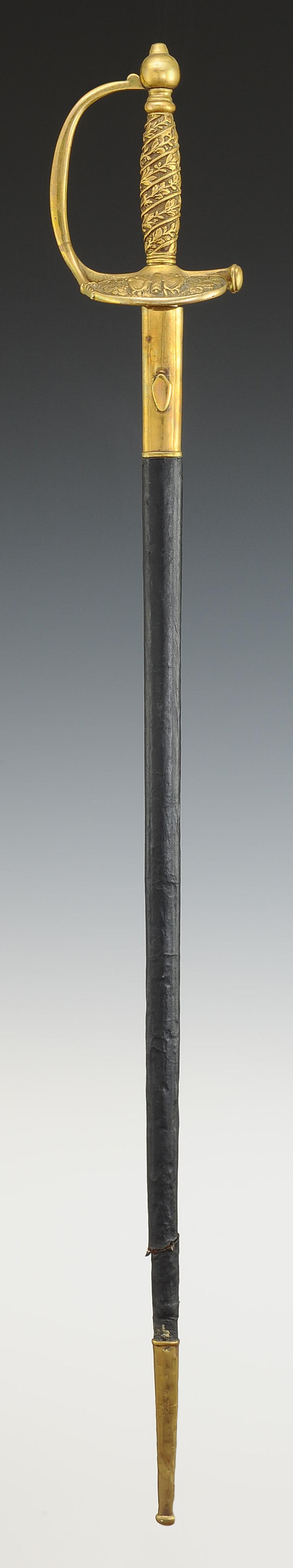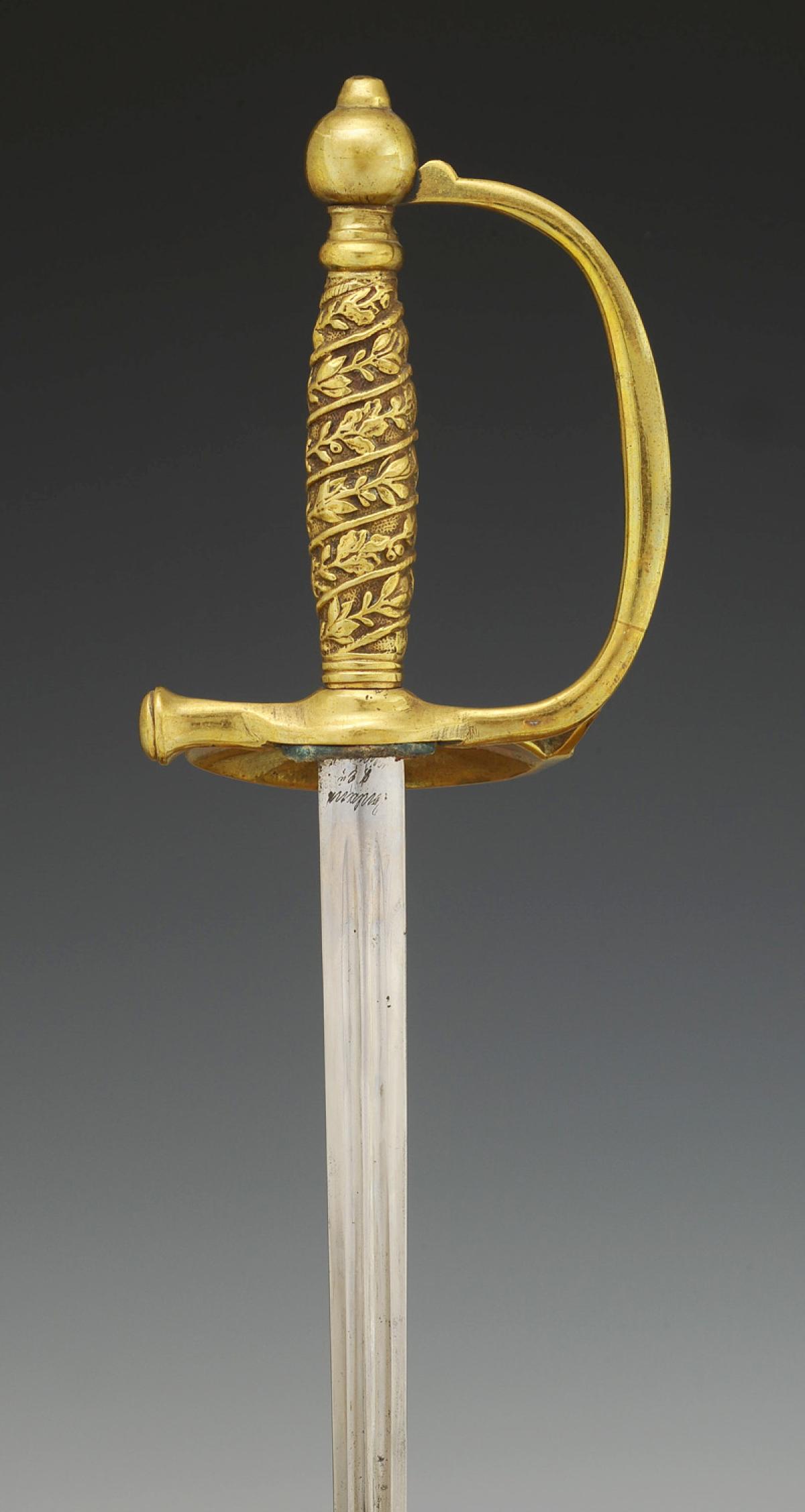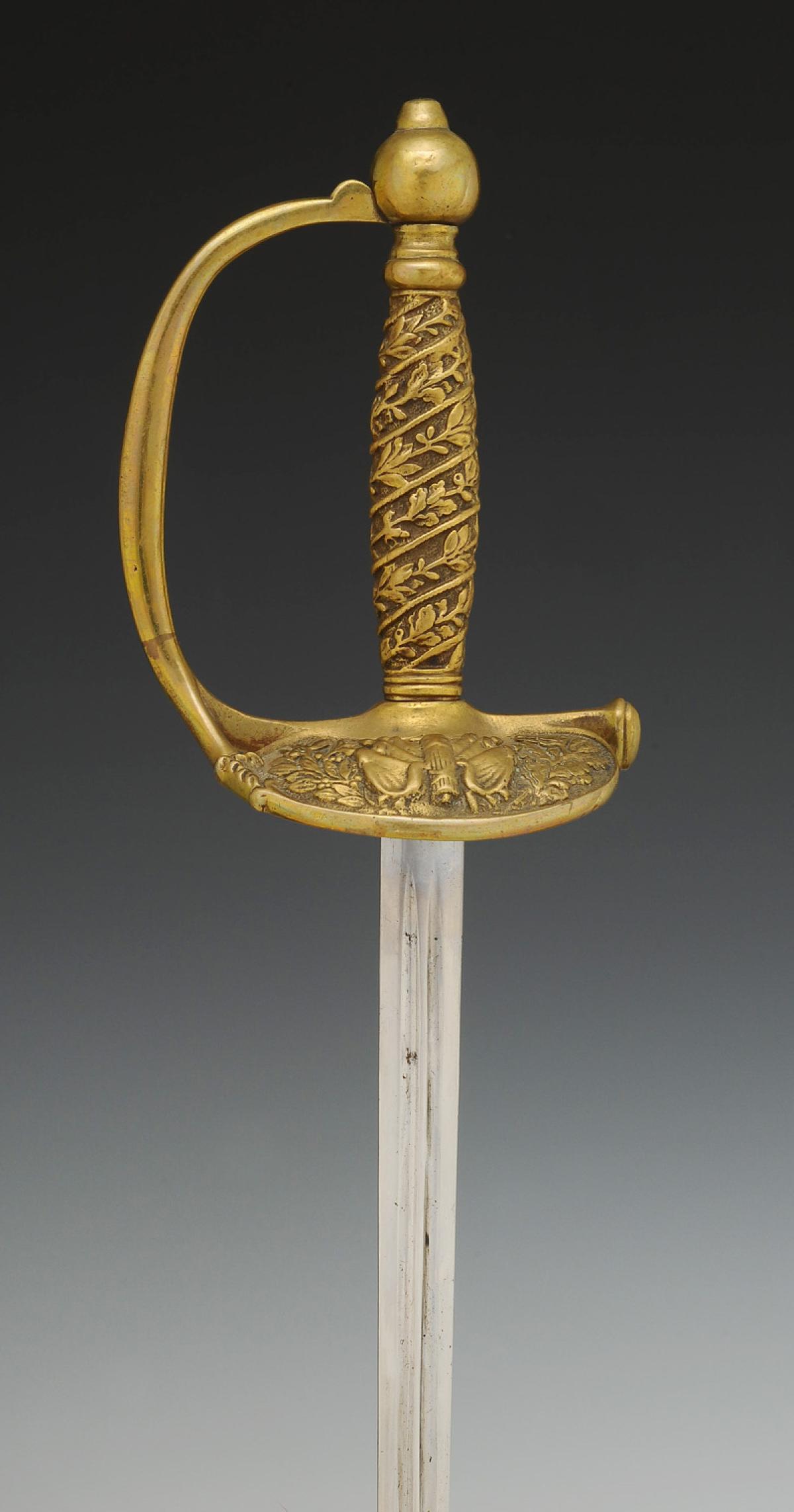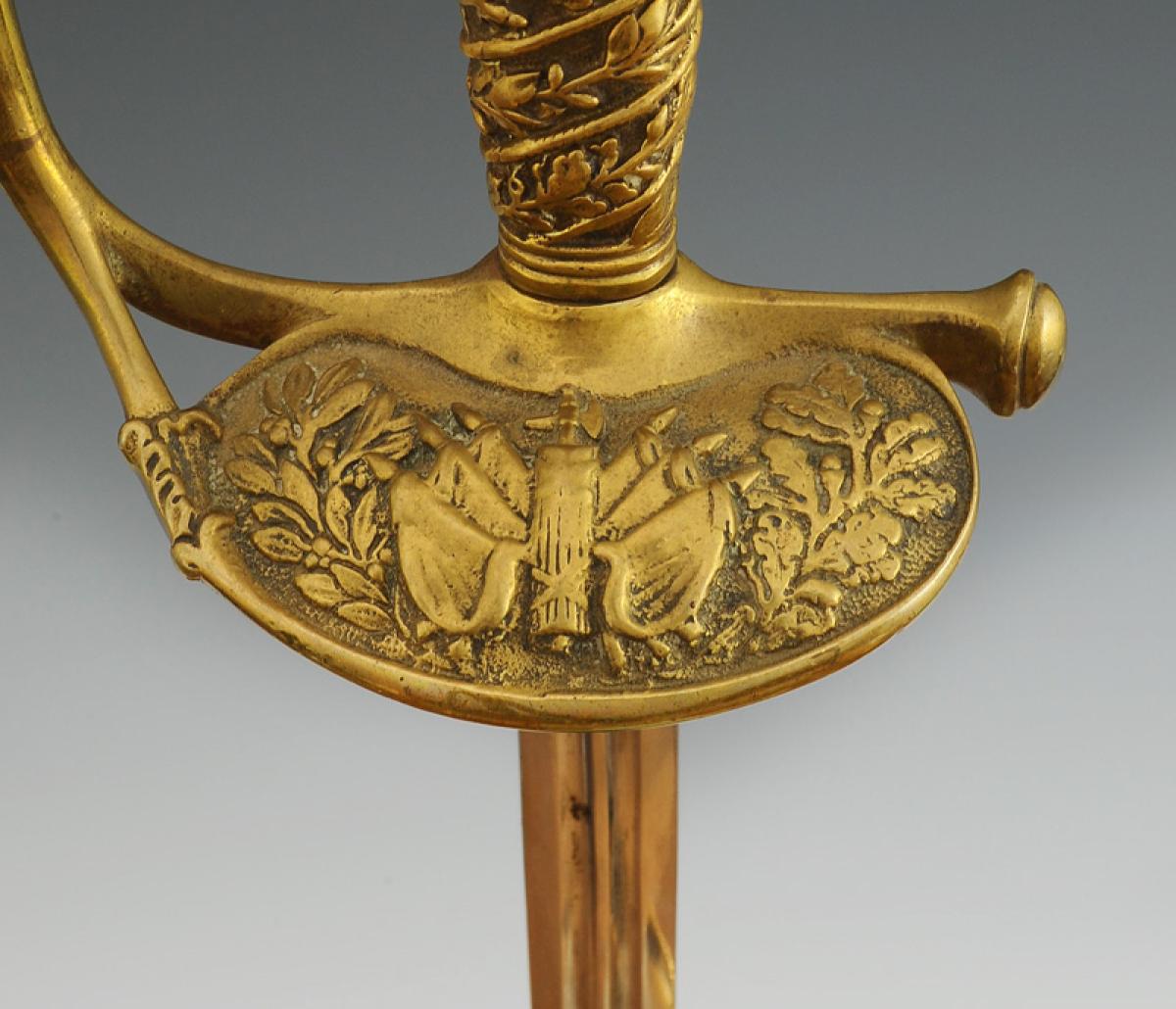 Monture en laiton. Garde à une branche. Clavier moulé en relief d'un faisceau de licteurs posé sur un faisceau de drapeaux et branches de chêne et de laurier (sans contre-clavier). Pommeau uni de forme ronde. Poignée en laiton moulé de branches de chêne et de laurier s'enroulant vers le haut. Cravate en cuir naturel. Lame droite à gouttières et arête centrale, longueur 72 cm. Fourreau en cuir verni noir à deux garnitures de laiton, bout du fourreau terminé par une bouterolle en laiton, chape avec bouton pour le port au ceinturon en forme d'écu uni.