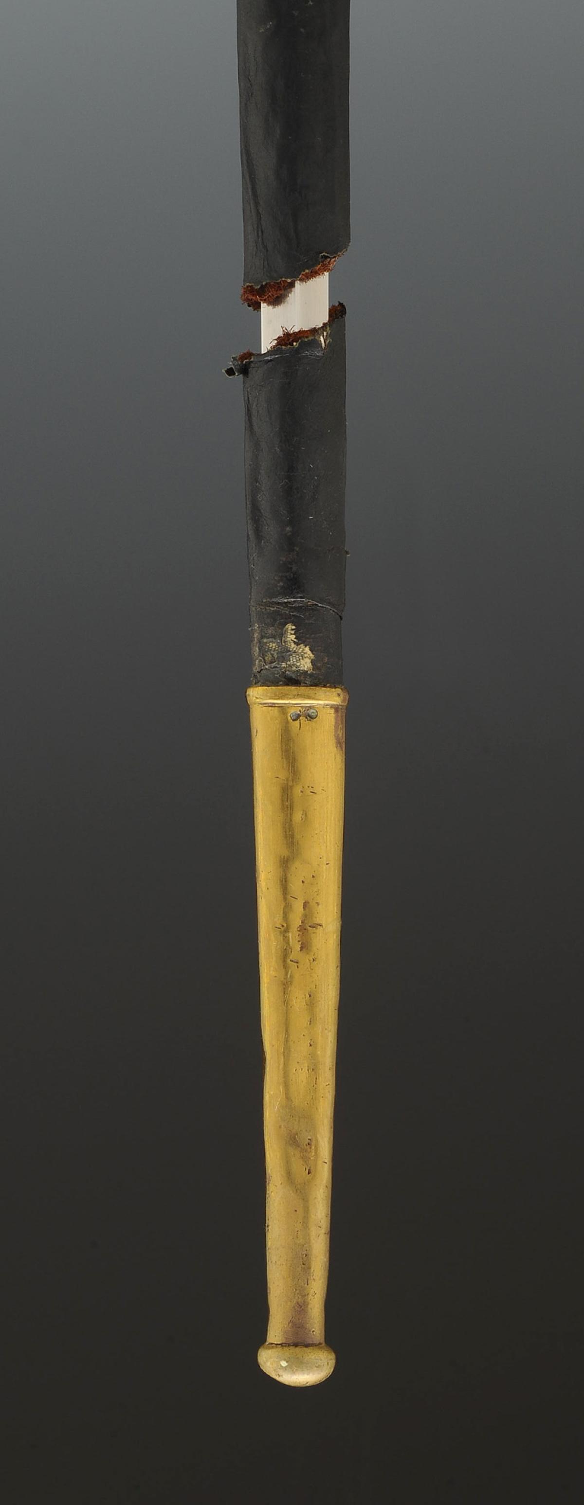Mauvais état, lame raccourcie, cuir du fourreau restauré et cassé (sans manque) dans son dernier tiers.