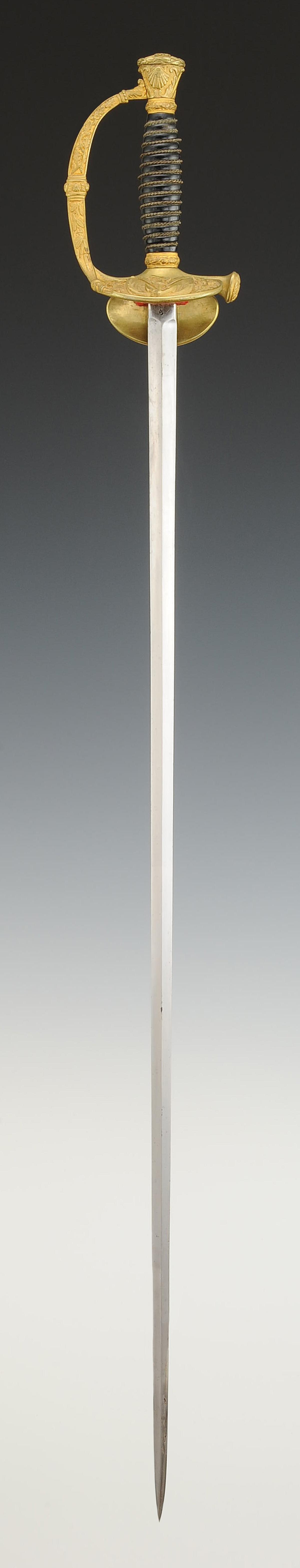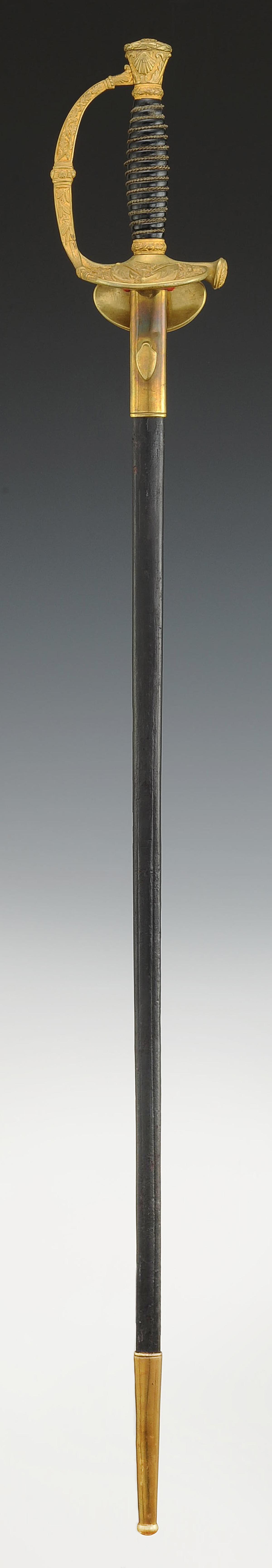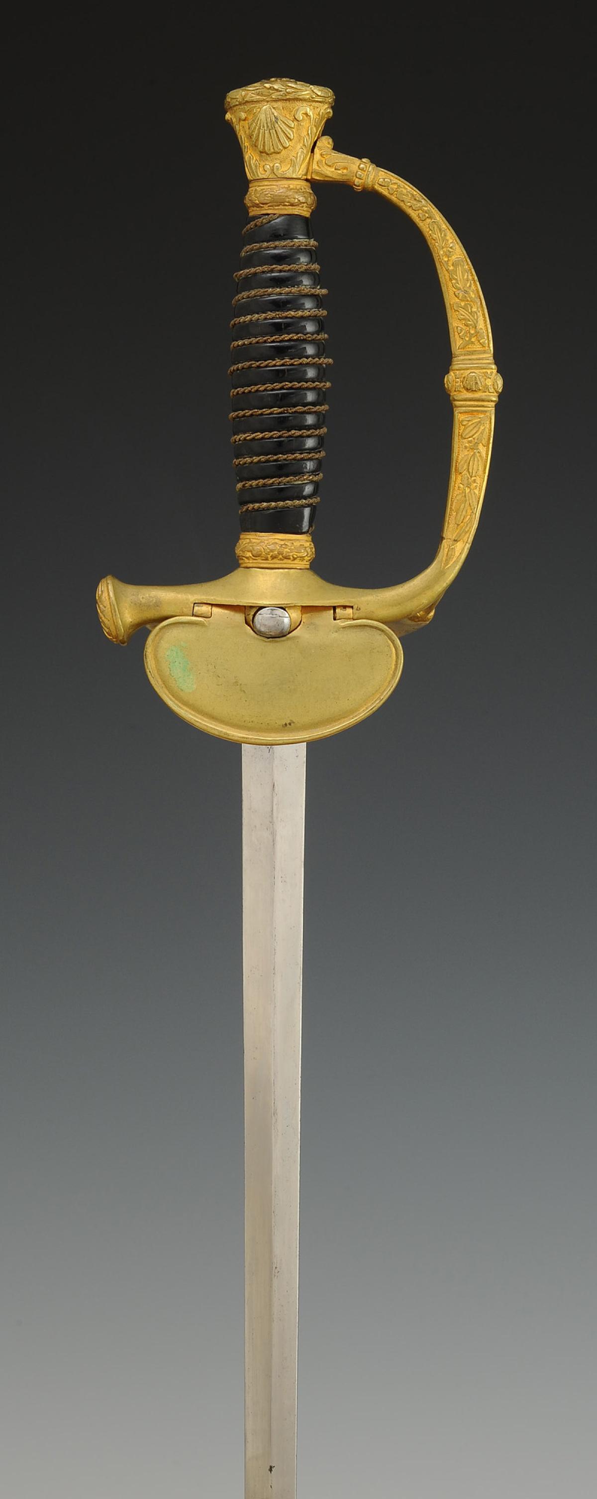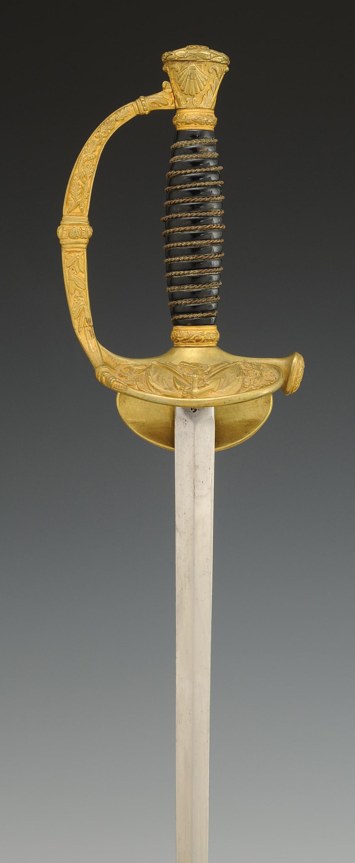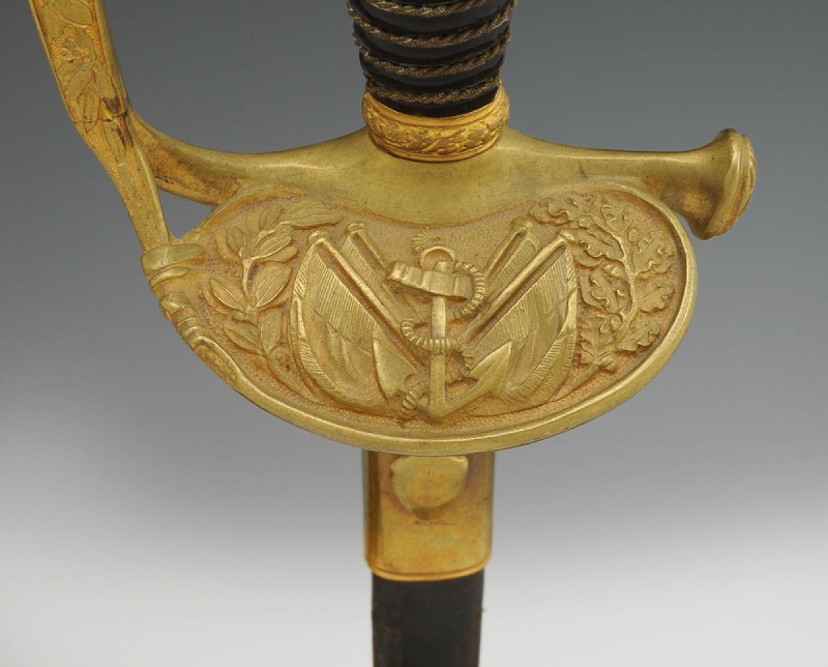 Monture en laiton doré. Garde à une branche décorée de feuillages. Clavier bivalve moulé en relief d'une ancre de marine posée sur un faisceau de drapeaux avec branches de chêne et de laurier. Contre-clavier ployant. Pommeau pyramidal décoré de coquilles Saint Jacques. Viroles décorées de branches de chêne. Poignée en bakélite noire filigranée de cuivre argenté. Cravate en drap écarlate. Lame à arête centrale de 76 cm de long. Fourreau en cuir verni noir à deux garnitures de laiton, chape avec bouton lisse pour le port au ceinturon, bout du fourreau avec bouterolle laiton.
