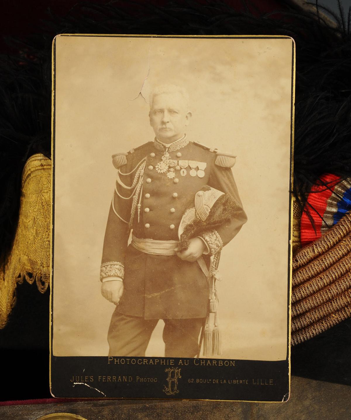 Photographie représentant le général en pied en grand uniforme avec son chapeau bicorne, H 16,3 cm x 10,5 cm.