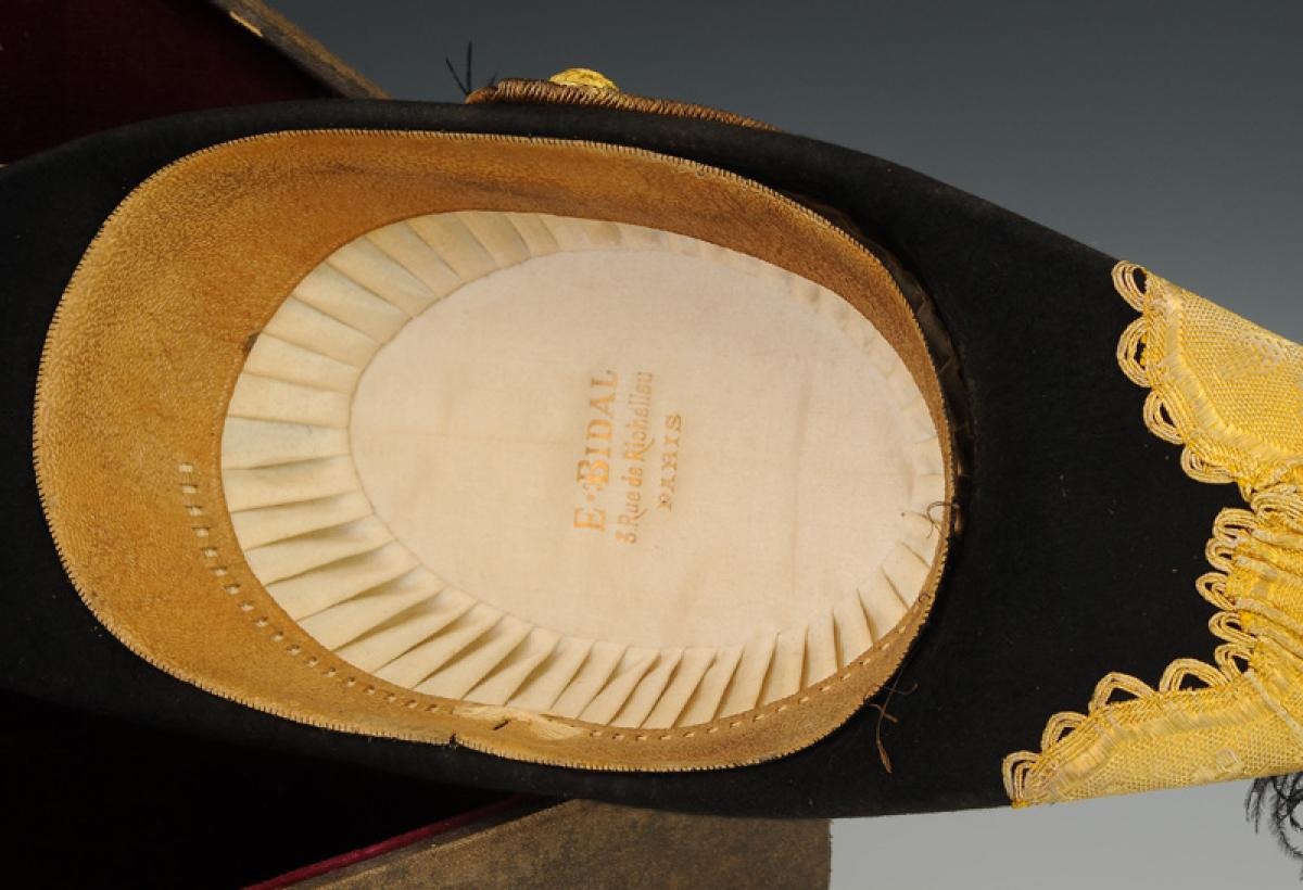 En feutre noir « flamand » souligné d'un large galon doré dit « bord de général », festonné à crête, tissé d'une double branche de chêne avec ses fruits ; plume d'autruche noire frisée cousue à l'intérieur des deux bords ; ganse formée de trois torsades dorées mates, se redoublant autour d'un bouton d'uniforme doré de gros module pour général modèle 1872 (demi-bombé, doré bruni et mat, estampé en relief d'un trophée formé de drapeaux et d'un bouclier timbré d'une étoile, surmontée d'une couronne civique), cocarde tricolore Ø 7,5 cm. Coiffe intérieure en soie ivoire marquée à l'or « E•BIDAL / 3• rue de Richelieu / Paris ». Bandeau en veau laqué ocre avec ruban de soie ivoire.