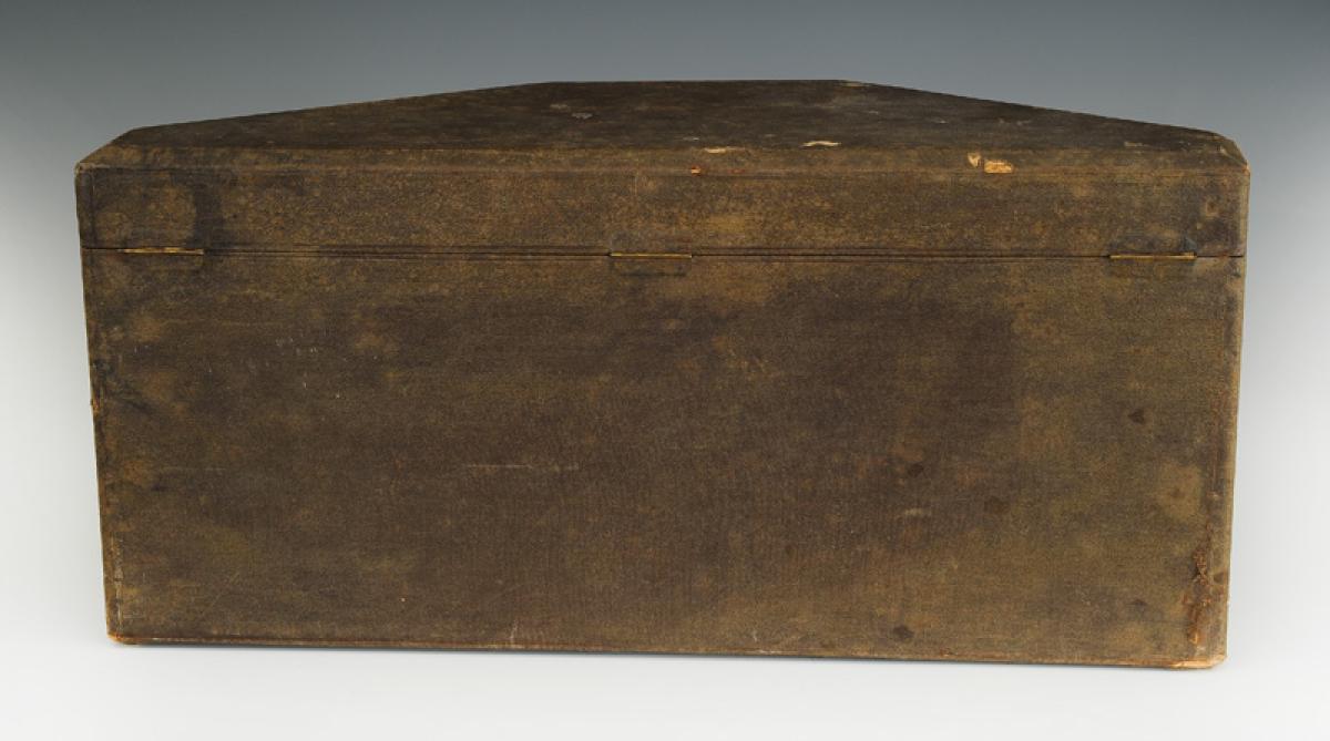 Bicorne en parfait état. Boîte de transport en bon état avec frottements et quelques manques au papier, manque la clé. Accident à la photo.