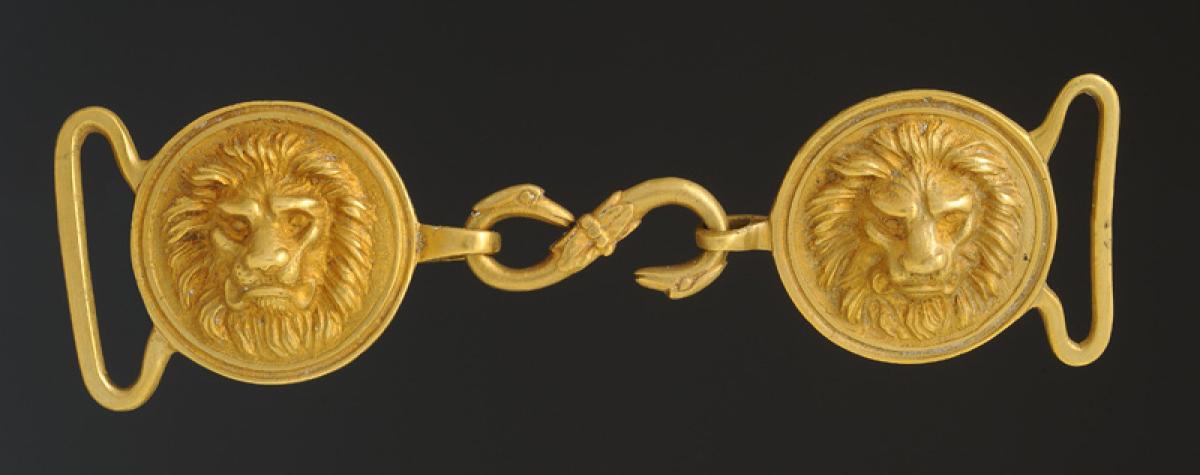 Plaques de forme ronde en bronze fondu repris au ciselé et doré au mercure, Ø 4,3 cm. Chacune est moulée en relief d'une tête de lion.