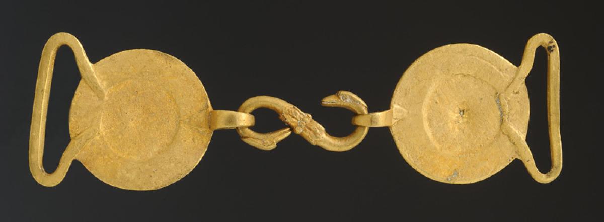 Sur le côté interne de chaque boucle, un anneau rond est soudé permettant de relier les deux boucles entre elles au moyen d'un crochet en S décoré d'une double tête de serpent.