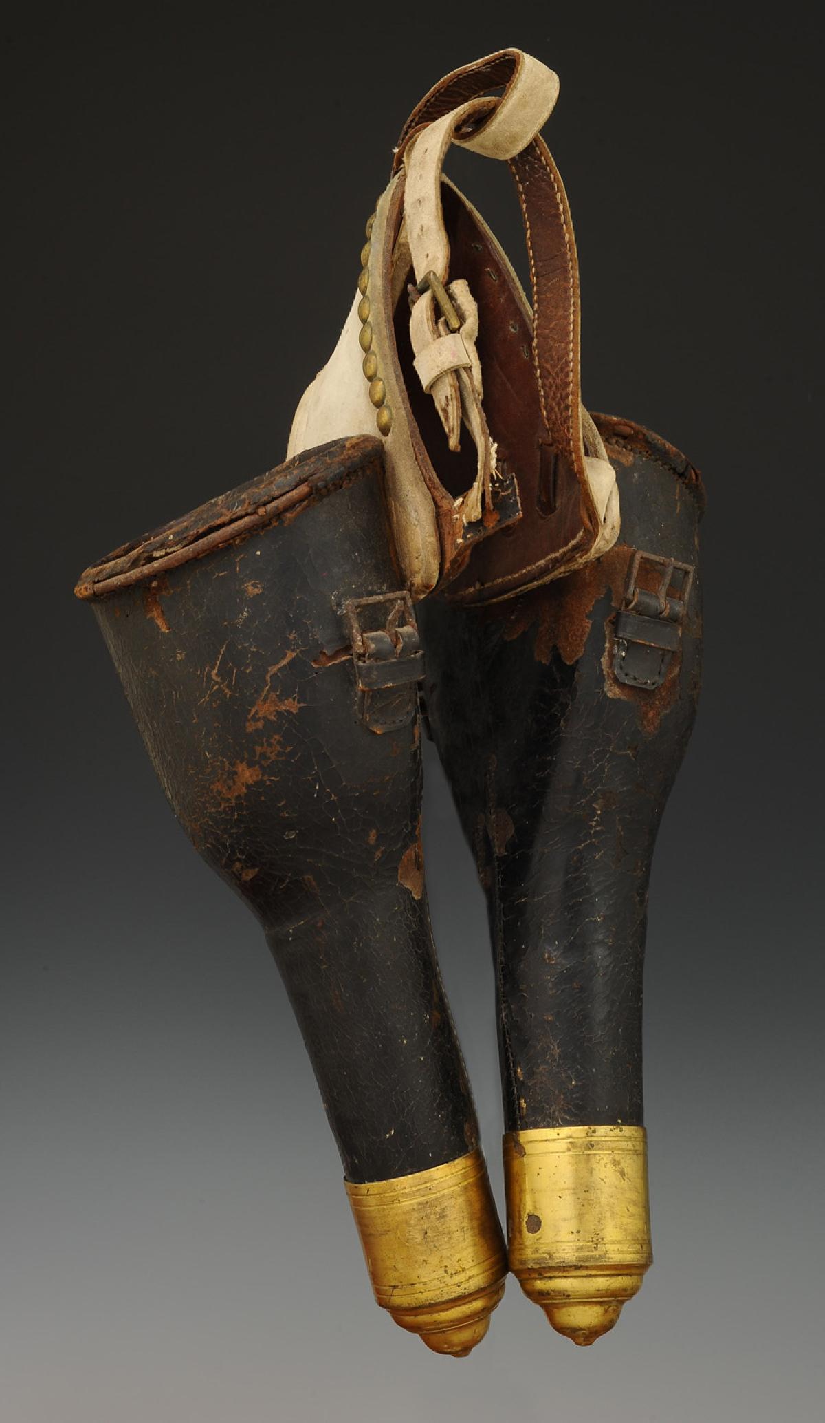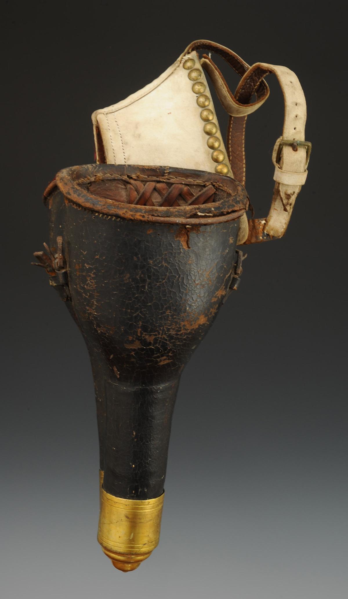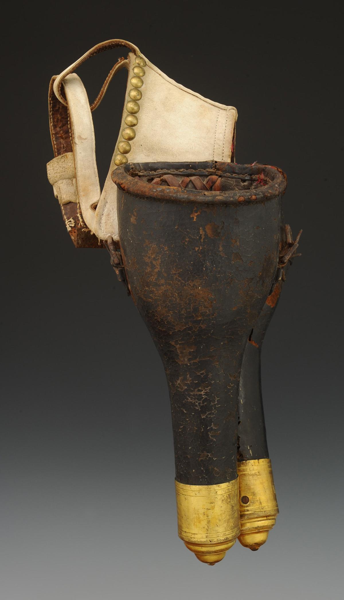 En cuir ciré brun avec embouts en laiton doré H 7,5 cm, H totale 32,5 cm, dimensions internes en partie supérieure largeur 12 cm et profondeur 7 cm, reliées entre elles par un fort de cuir de vache recouvert de veau blanc clouté laiton.
