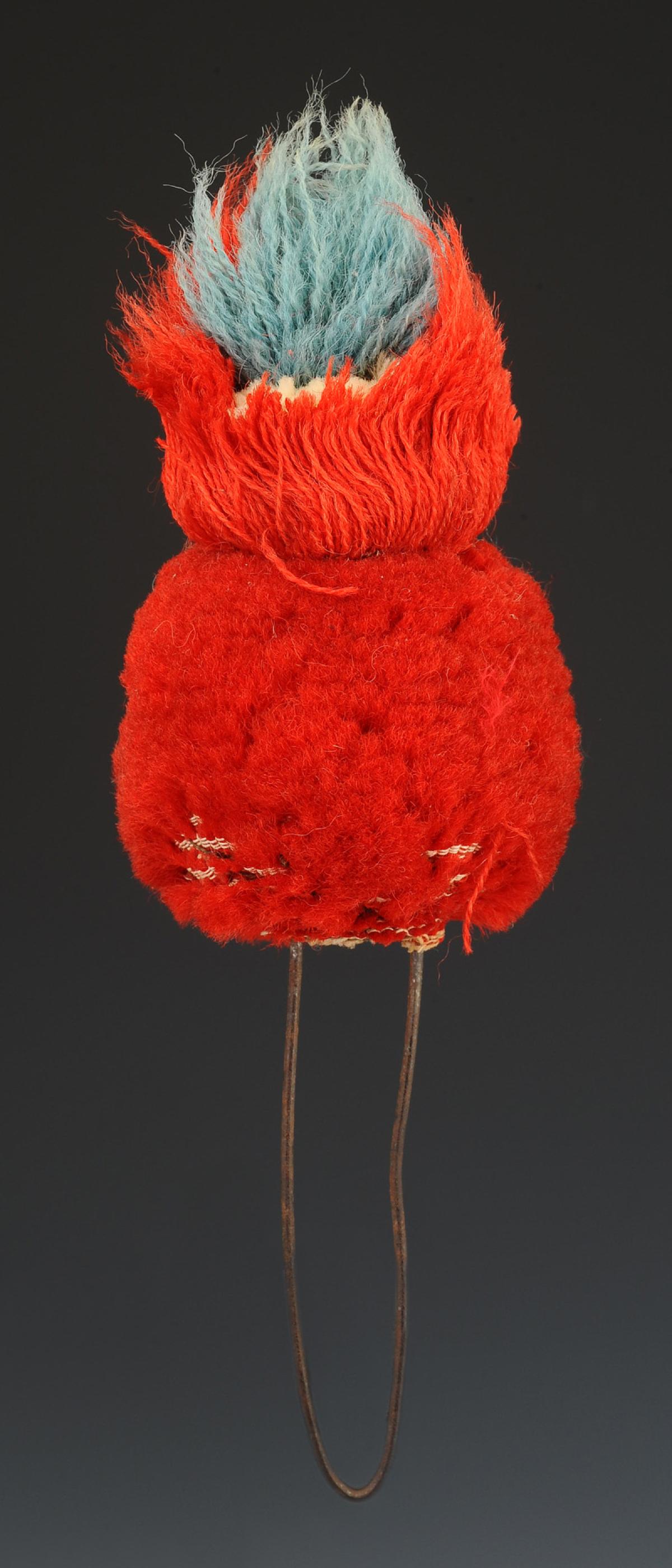 En laine écarlate composé d'un pompon sphérique monté sur bois, H 5,5 cm, surmonté d'une flamme tricolore, H 6 cm. Monté sur un fil d'acier, H apparente du fil d'acier 8,5 cm.