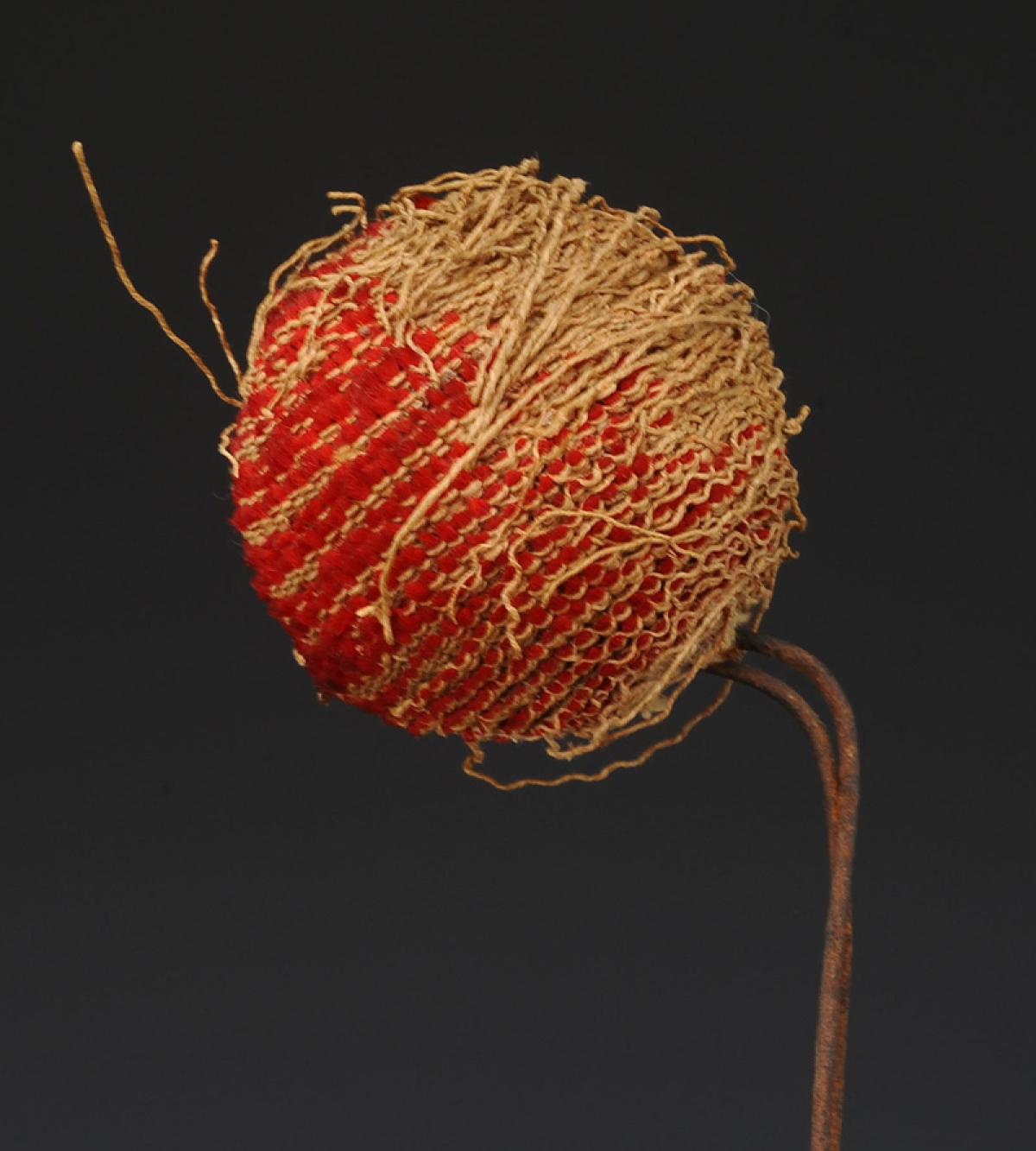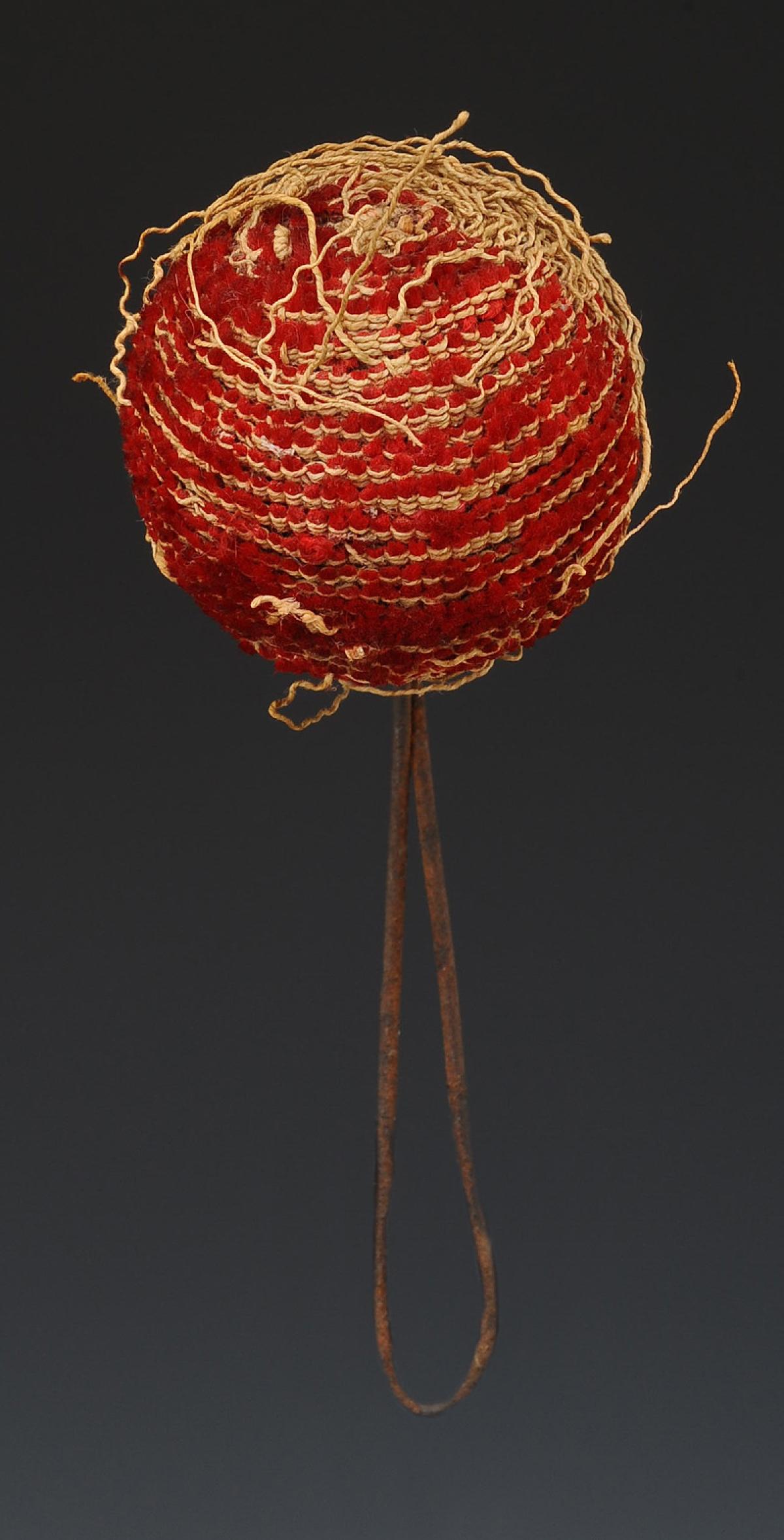 Pompon en laine de soie écarlate, Ø 5 cm. Monté sur une tige en fer, H apparente de la tige 9 cm.