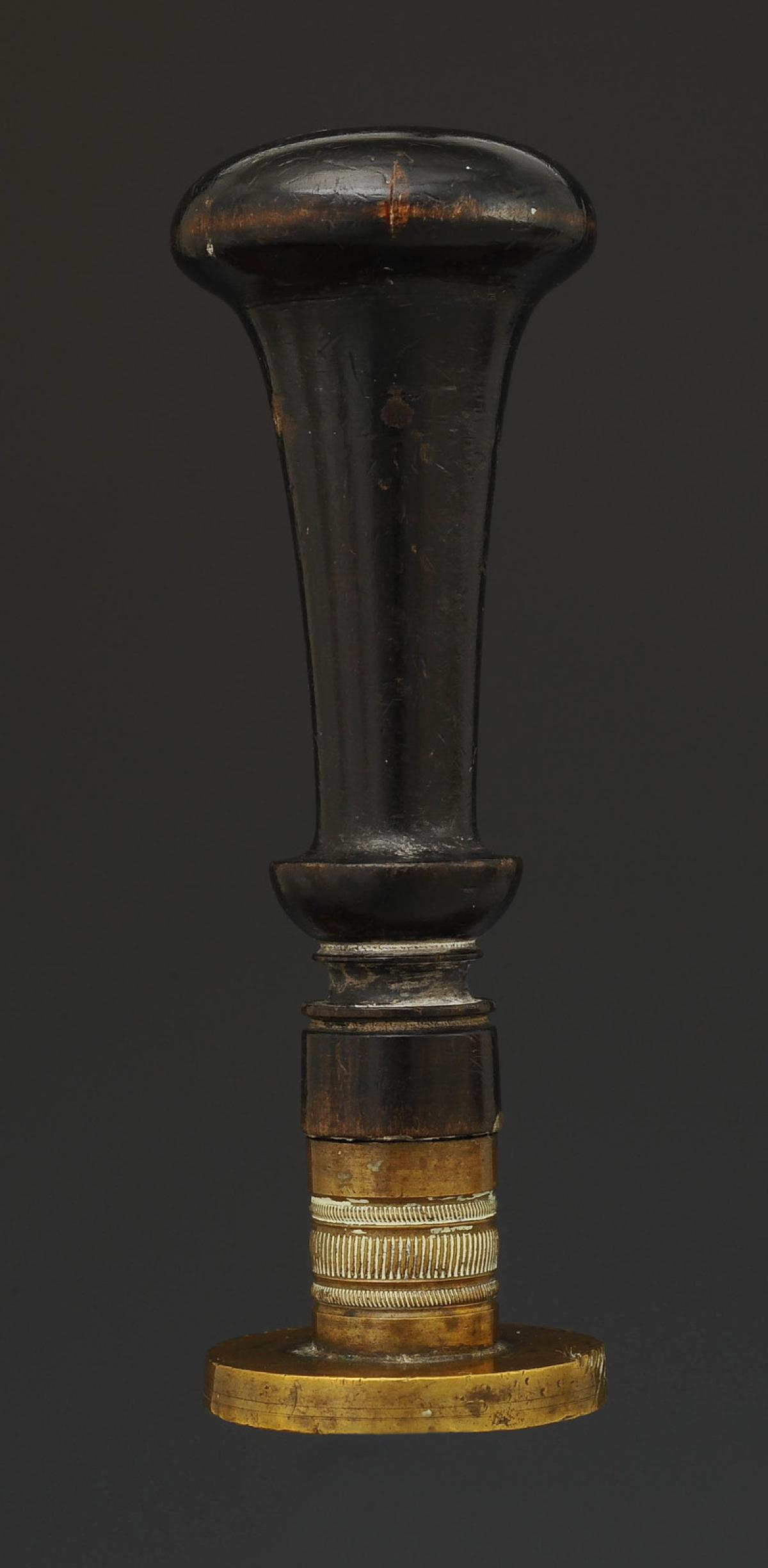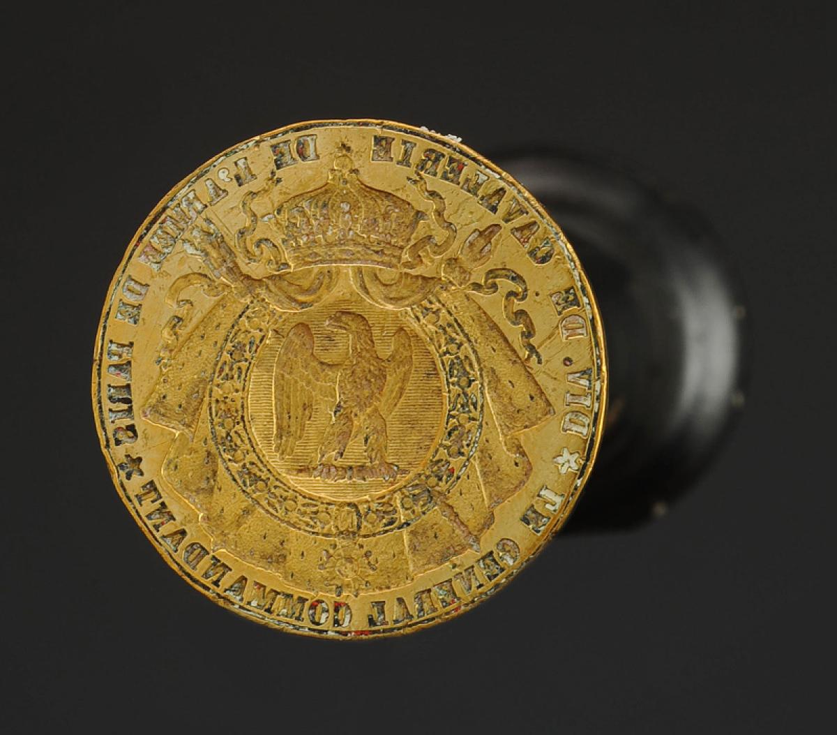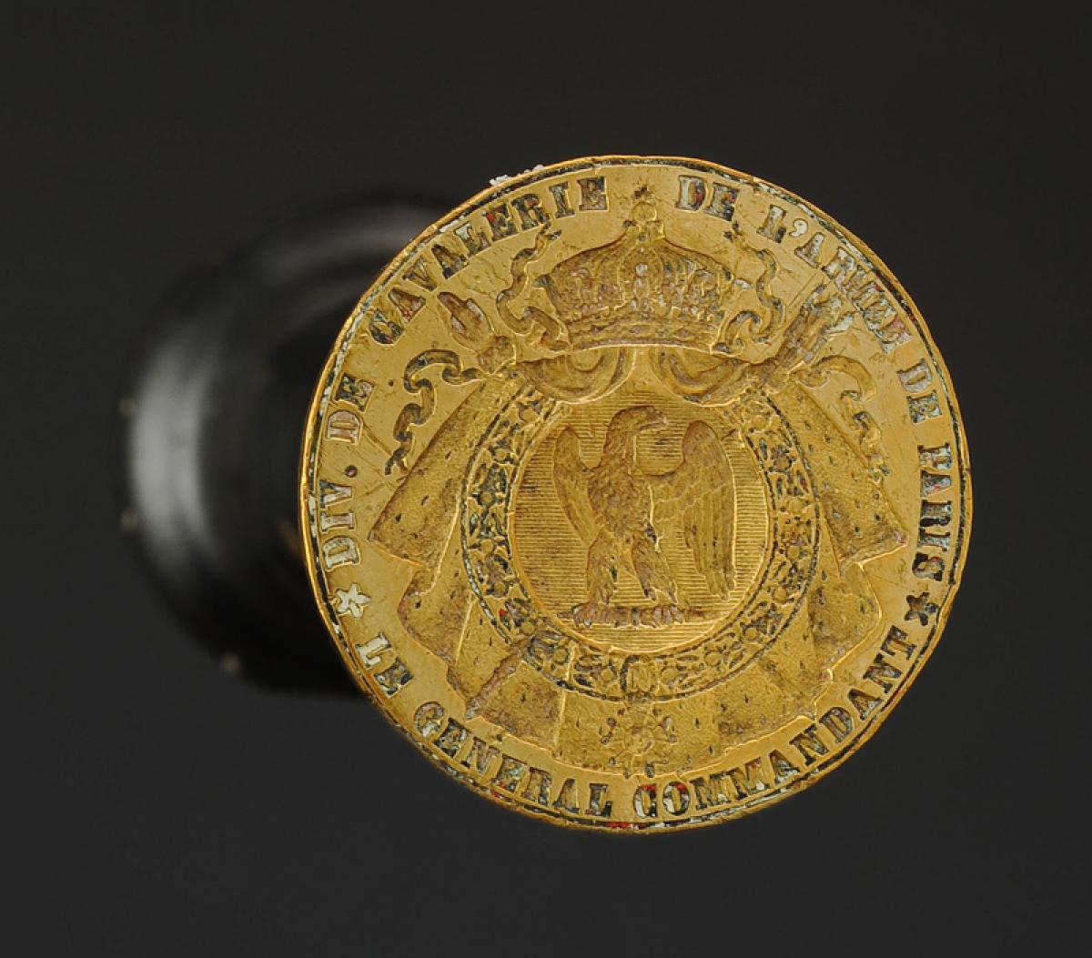 Stèle en laiton de forme ronde aux grandes armes impériales « LE GÉNÉRAL COMMANDANT DE DIV. DE CAVALERIE DE L'ARMÉE DE PARIS ». Ø 3,3 cm. Manche en bois tourné, H 10,2 cm.