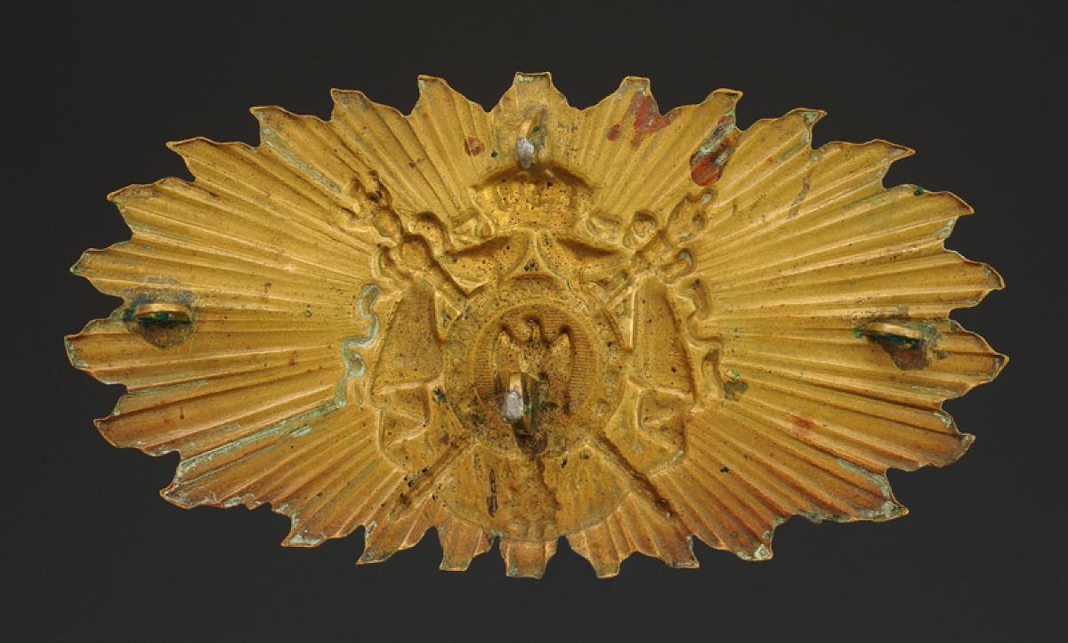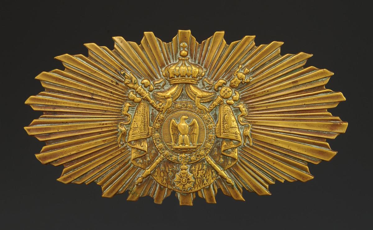 Plaque en laiton estampé d'un soleil rayonnant avec en son centre les Grandes Armes Impériales, H de la plaque 6,9 cm x 12,6 cm.