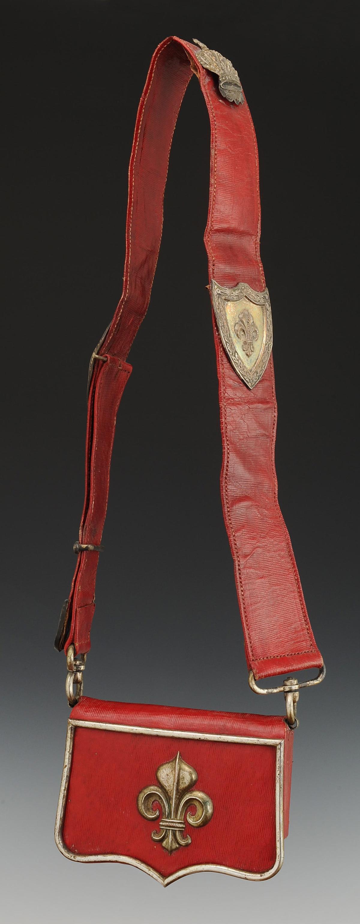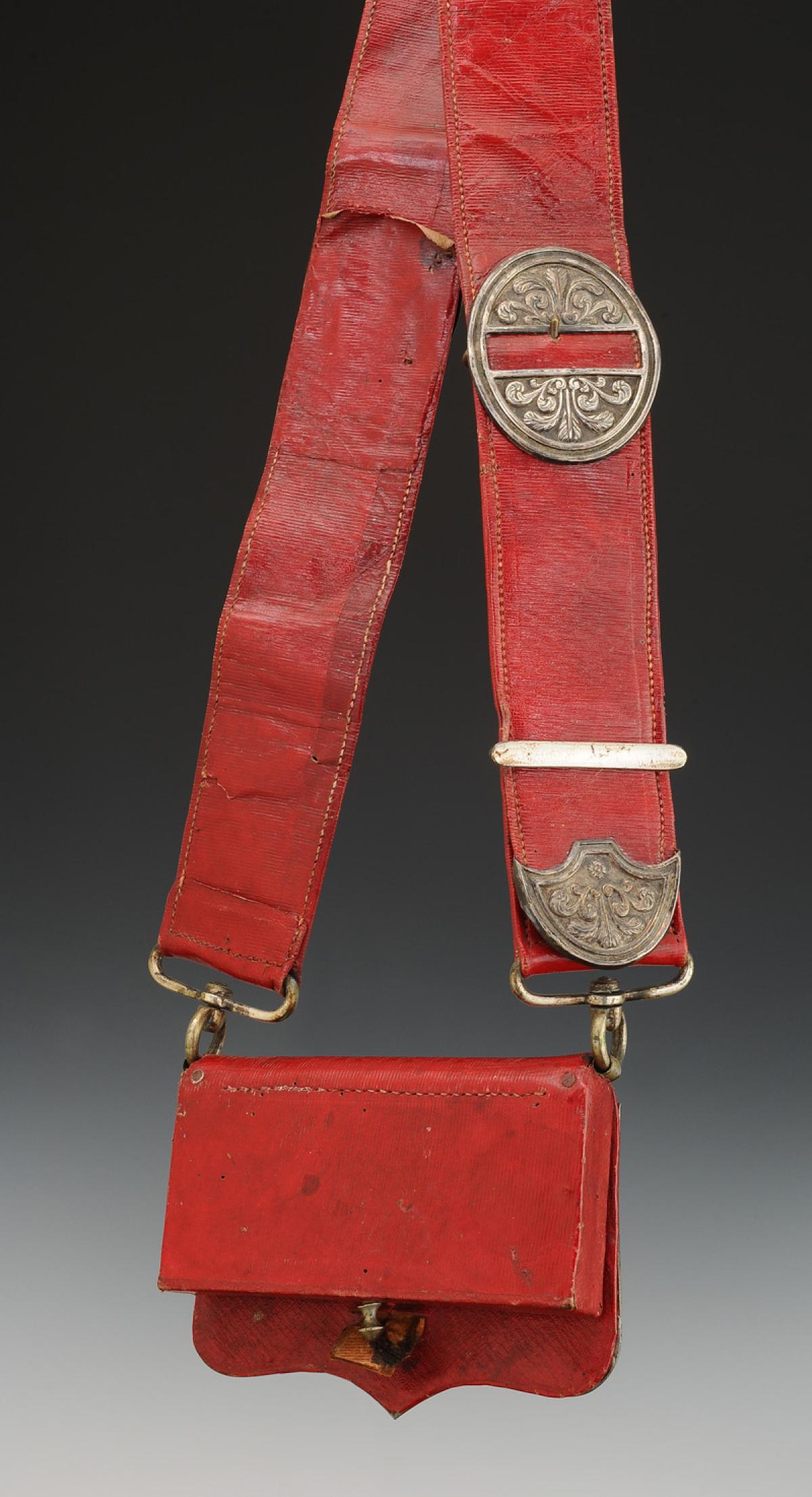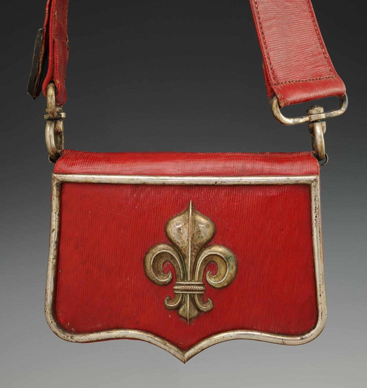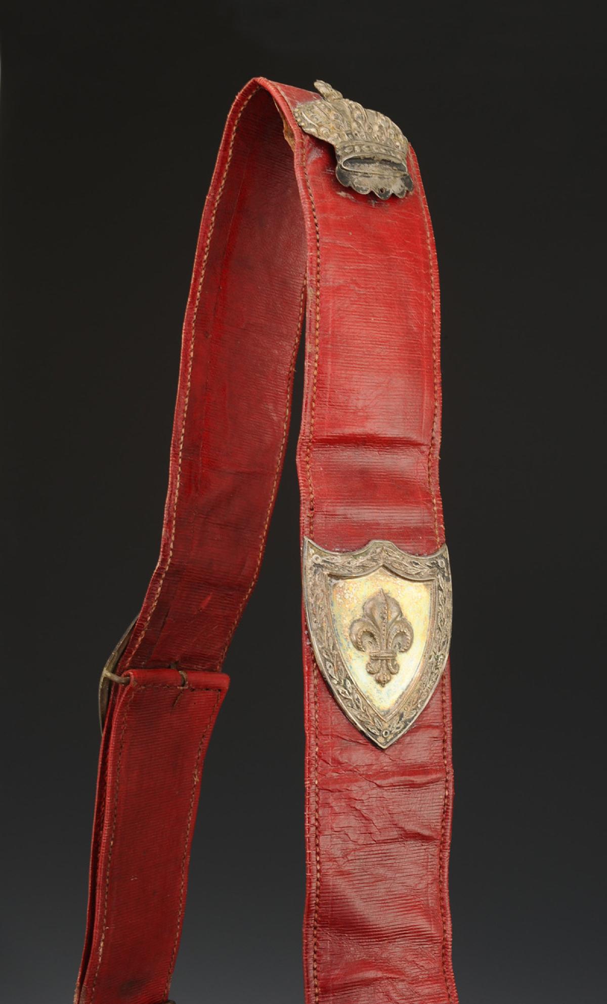 Banderole en cuir bordeaux piqué de chaque côté d'une baguette en fils de soie bordeaux, largeur 5,7 cm. Garnitures en cuivre argenté décorées en relief de plumes, écusson fleurdelysé.