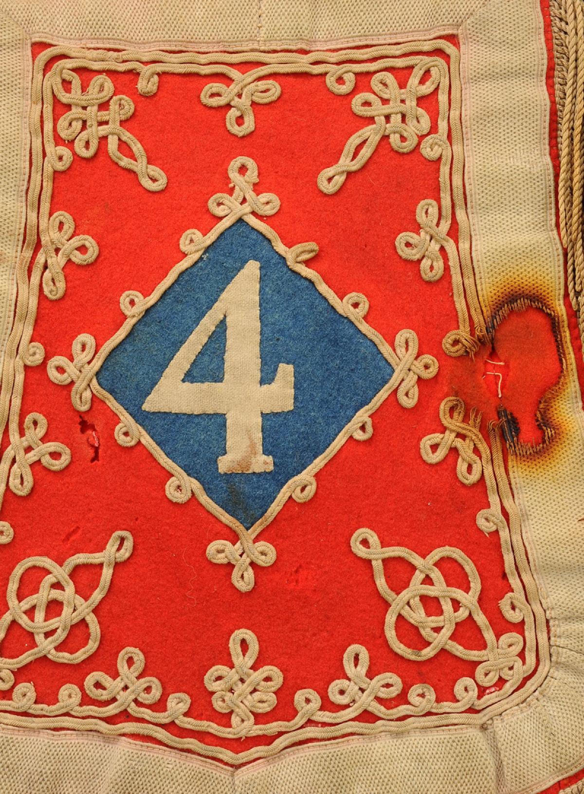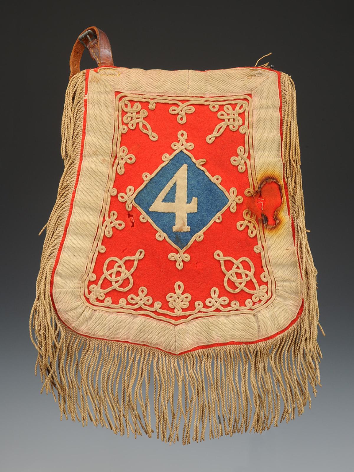 En drap garance (H 28,5 cm, largeur en partie basse 26 cm, 19,5 cm en partie haute) bordée de franges en laine blanche (H 9,5 cm) et d'un galon de 2,6 cm de large souligné sur le côté intérieur d'un cordonnet en laine blanche formant des noeuds hongrois. En son centre sur une face un losange en drap bleu de ciel bordé d'un passepoil en tresse blanche et garni en son centre du chiffre « 4 » en drap blanc, et de l'autre côté un même décor mais avec en son centre un « H » en drap blanc. En partie haute, une courroie en cuir brun est cousues avec petite boucle en fer pour la fixation à la trompette.