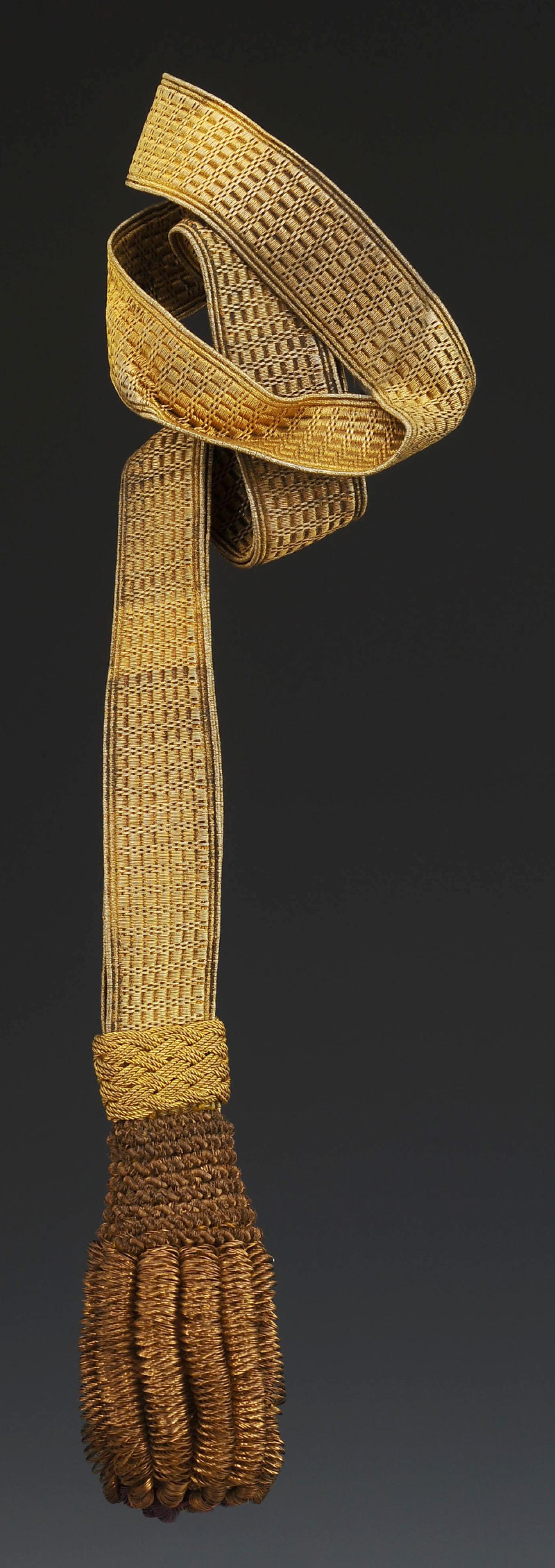 Entièrement en passementerie dorée, composée d'un cordon plat, largeur 2 cm, et d'un gland à franges à grosses torsades dites « graines d'épinard ». Longueur du cordon 34 cm, longueur complète avec les franges 41 cm.