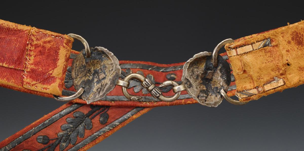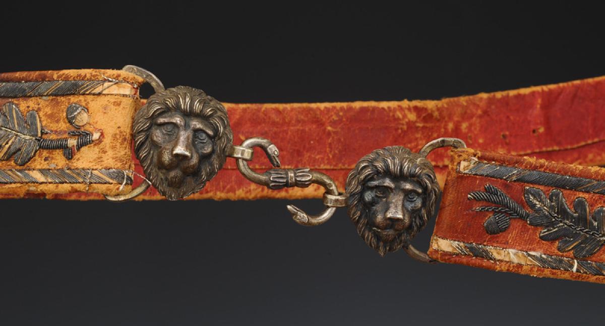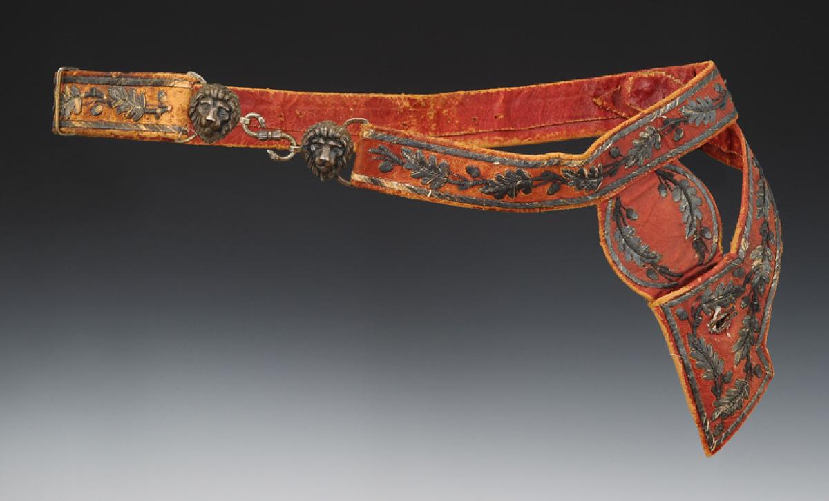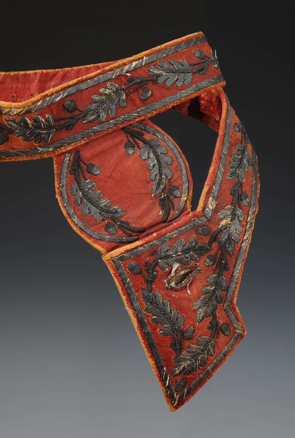 En veau, entièrement recouvert de velours écarlate brodé d'une branche de feuilles de chêne en fils, cannetilles d'argent, bordé sur chaque bord d'une baguette d'argent brodé en fils, largeur du ceinturon 3,9 cm. Bouclerie en argent fermant à l'avant au moyen de deux têtes de lion, H 3,8 cm x 3,1 cm, chaque tête de lion est garnie sur sa partie extérieure d'un anneau pour le passage du ceinturon et sur la partie intérieure d'un anneau recevant un crochet en forme de S à double tête de serpent assurant la fermeture.