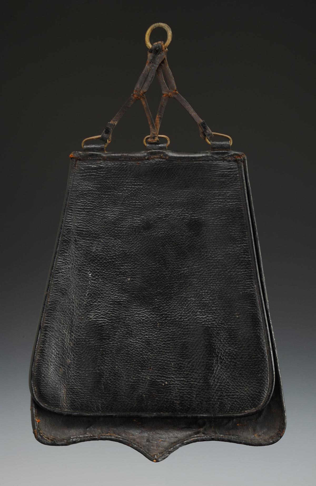 Poche intérieure en cuir verni noir, doublée de drap écarlate.
