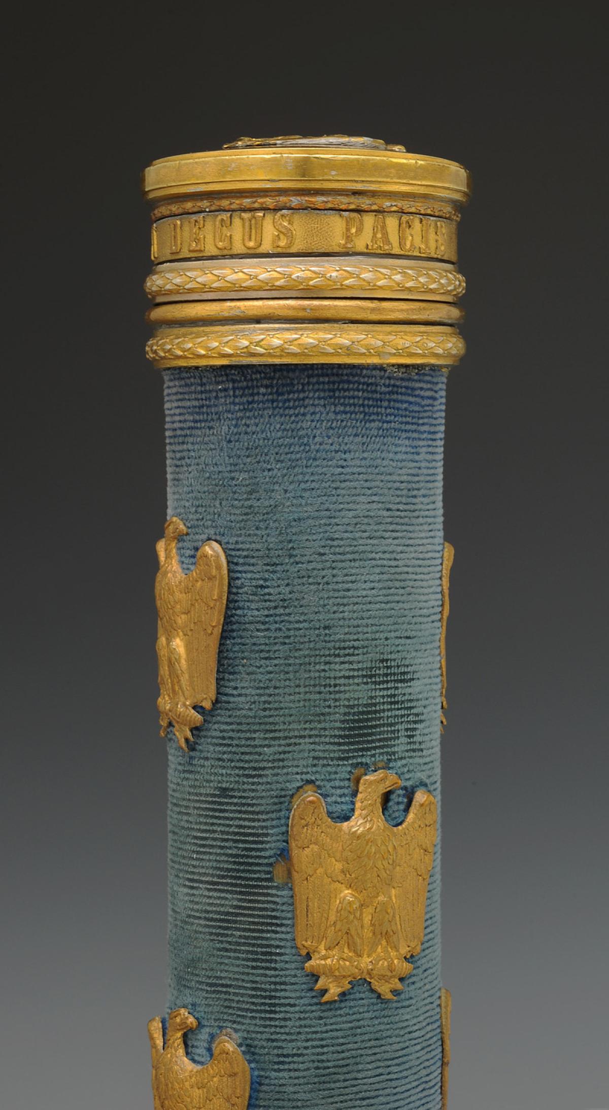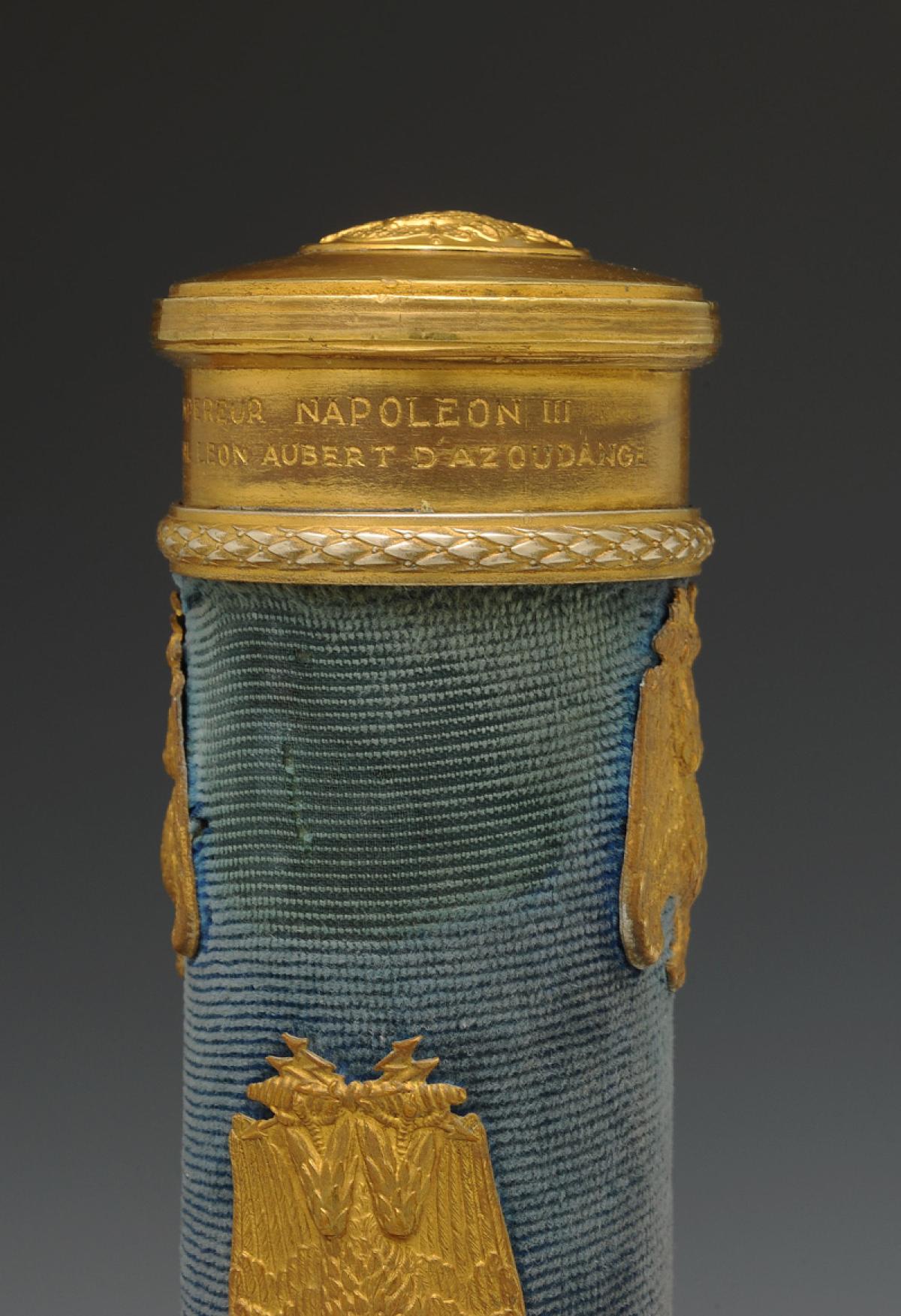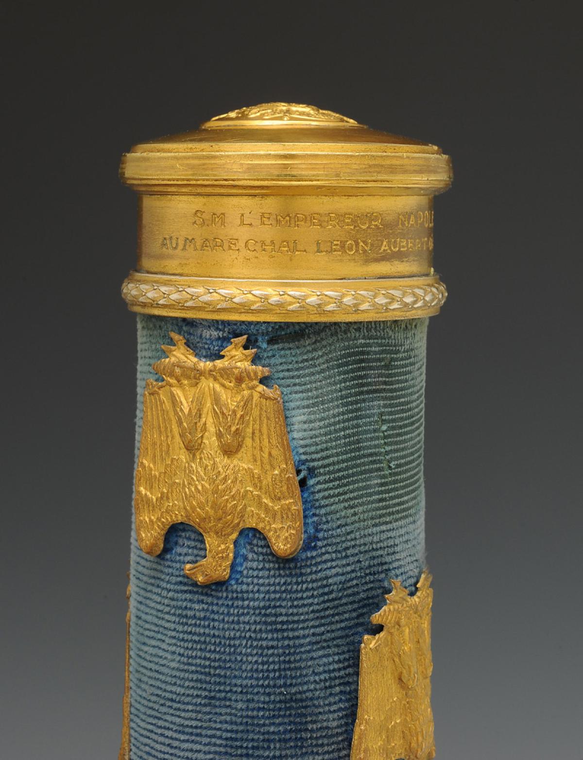 En métal, gainé d'un velours bleu de roi, décoré en applique de vingt aigles rapportées en laiton estampé et découpé (H de chaque aigle 3,5 cm x 2,7 cm). Bâton terminé à chaque extrémité par des embouts en métal doré ; l'un des embouts porte l'inscription en relief « TERROR BELLI DECUS PACIS » (qui se traduit en français par « Terreur en temps de guerre, honneur en temps de paix », est une locution latine gravée sur les bâtons de Maréchal de France. Il s'agit de la devise de la famille de Contades) avec couronne de feuilles de laurier et à son extrémité une aigle impériale non couronnée ; l'autre embout est gravé « 29 JUILLET 1866 S.M. L'EMPEREUR NAPOLEON III / AU MARECHAL LEON AUBERT D'AZOUDANGE », en sur son extrémité un médaillon frappé en relief des Grandes Armes Impériales.
