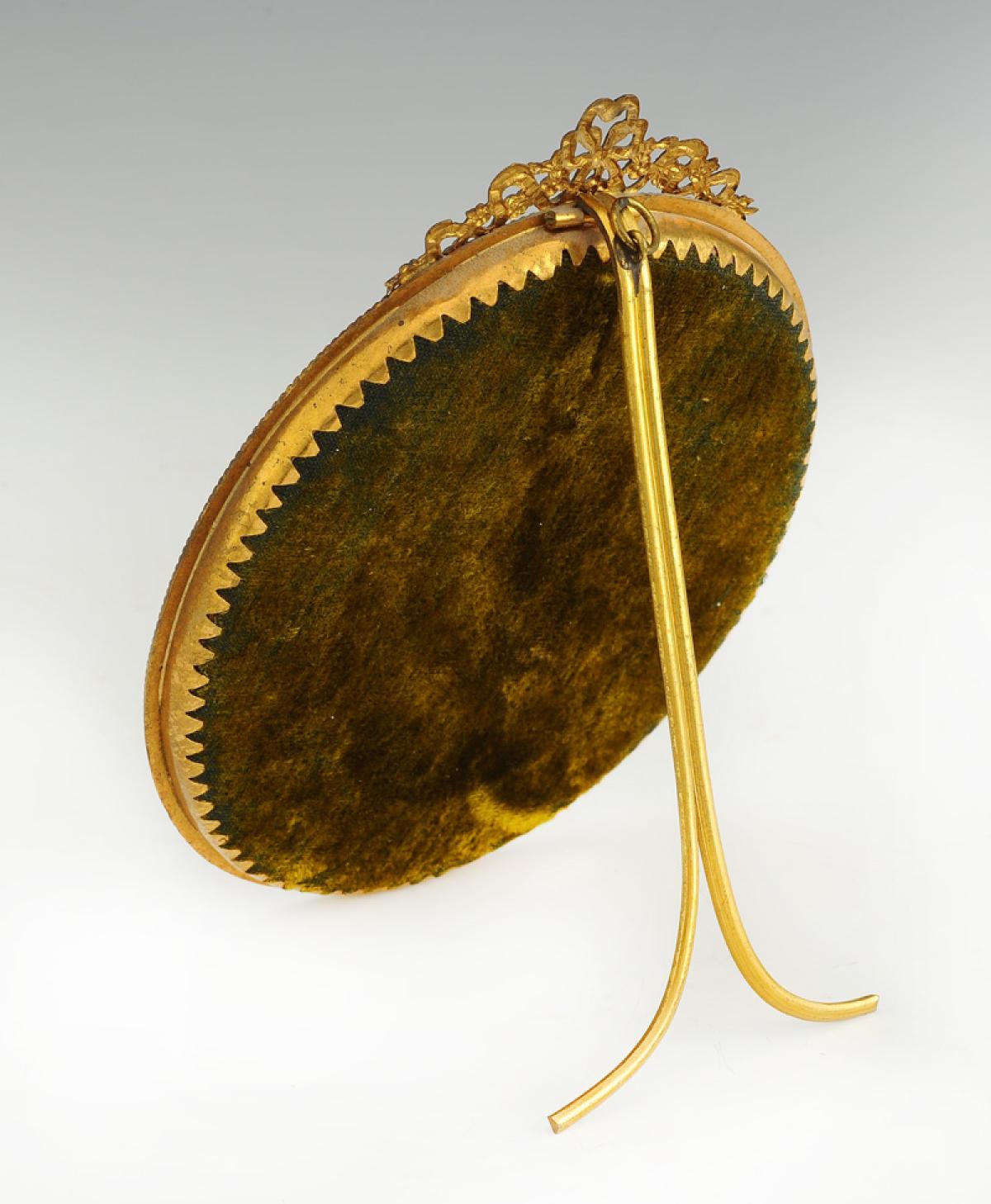 De forme ovale, H à vue 8,2 cm, largeur à vue 6,3 cm. Présenté sous verre dans un cadre à baguettes de laiton et plaquettes d'os, H 15,5 cm x 12 cm.