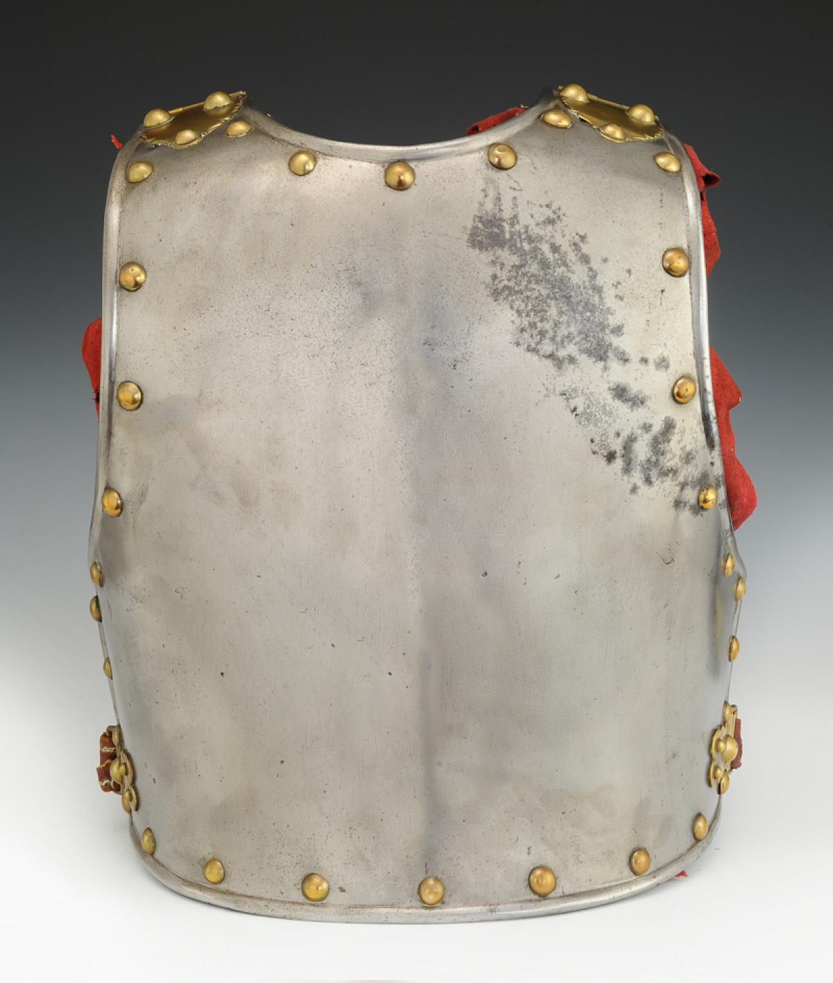 Plastron en acier bordé de 34 clous en laiton à tête ronde avec au centre deux clous saillants pour crocheter les épaulières. Il est doublé d'un gilet de matelassure en toile écrue à bandes bleu de ciel bordé d'une fraise écarlate ; en son centre est placée une grande poche. Plastron poinçonné « ZUDERELL ».