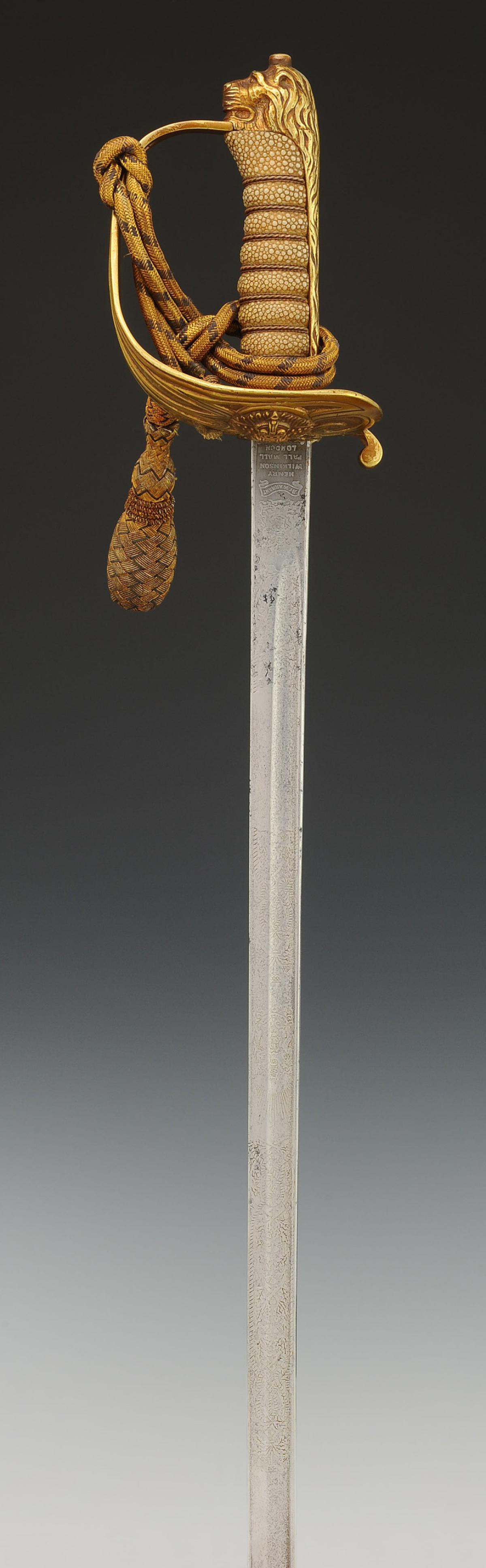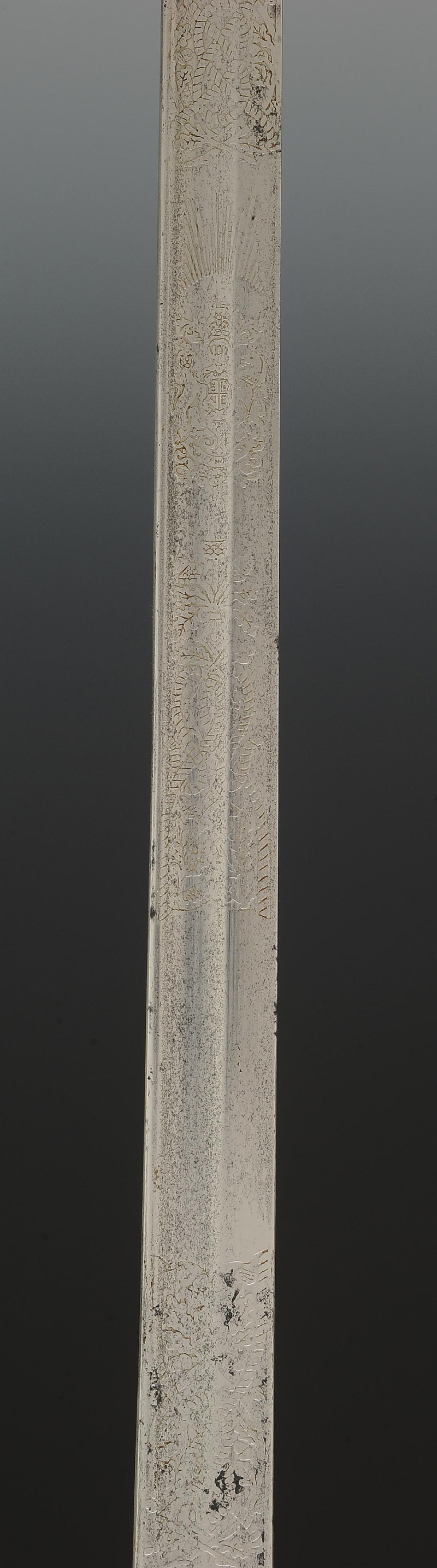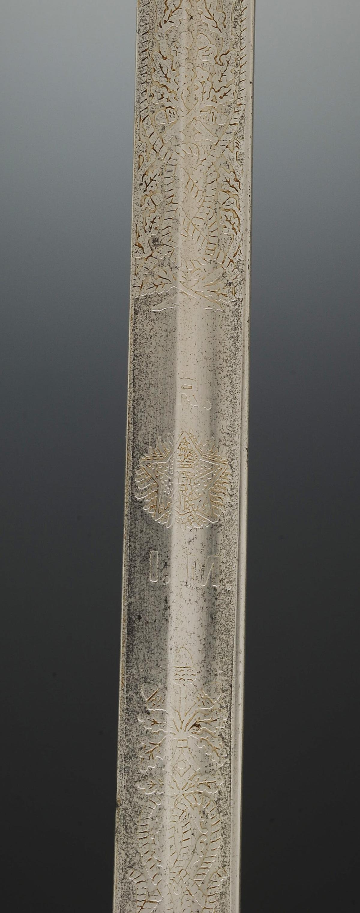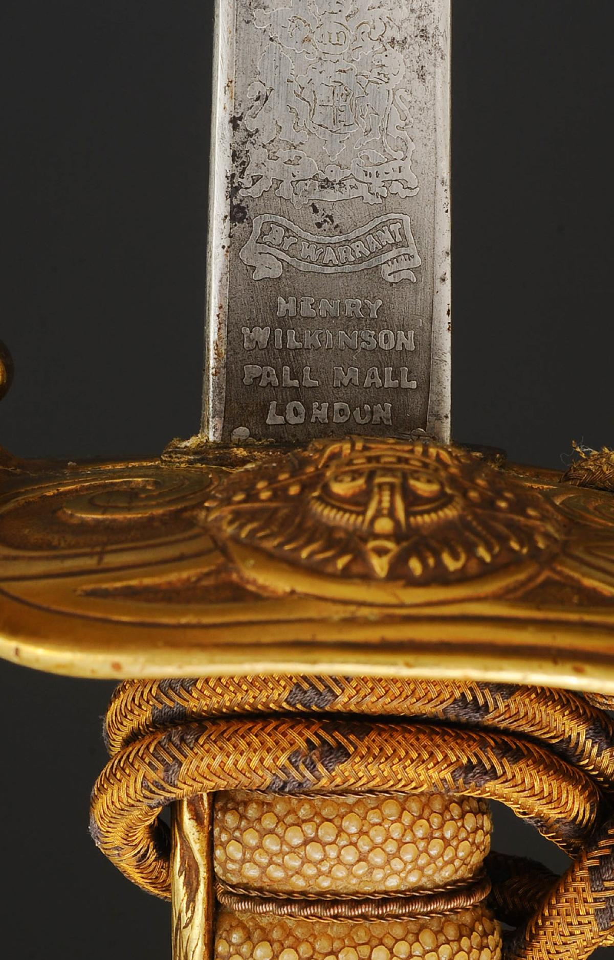 Monture en laiton. Garde à une large branche pleine décorée d'un médaillon moulé d'une ancre encablée couronnée sur fond d'une étoile perlée à soleil rayonnant. Calotte à longue queue en forme de tête de lion. Poignée en bois recouvert de galuchat blanc filigrané cuivre. Virole décorée aux traits. Cravate en cuir naturel. Lame droite à gouttières, longueur 81 cm, gravée sur ses deux tiers à l'acide sur chaque face : sur la face avant, signée au talon des armoiries Anglaises avec l'inscription « BY WARRANT / HENRY / WILKINSON / PALL MALL / LONDON » et gravée d'un décor végétal encadrant sur fond rayonnant les armoiries de l'Empire Indien (1) ; sur la face arrière au talon, une étoile à six branches, les initiales « R.I.M. » encadrant les armes de la marine indienne (étoile sur fond rayonnant). Dos de lame matriculé « 58094 ». Cravate en cuir naturel.