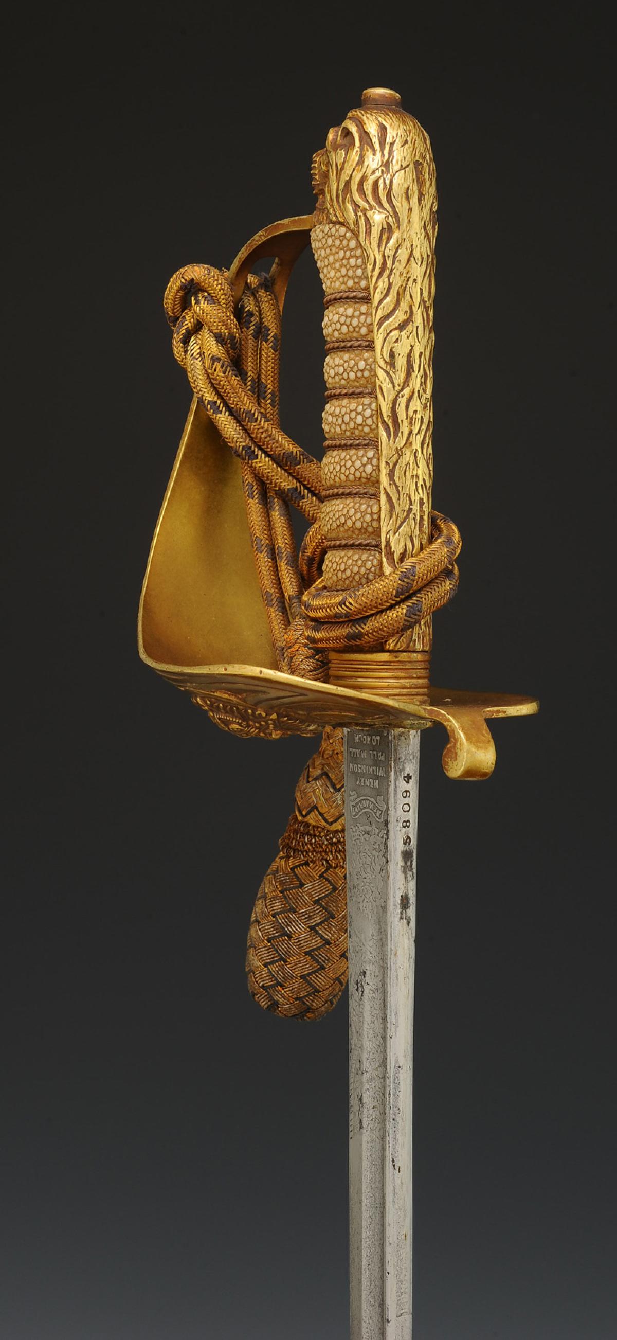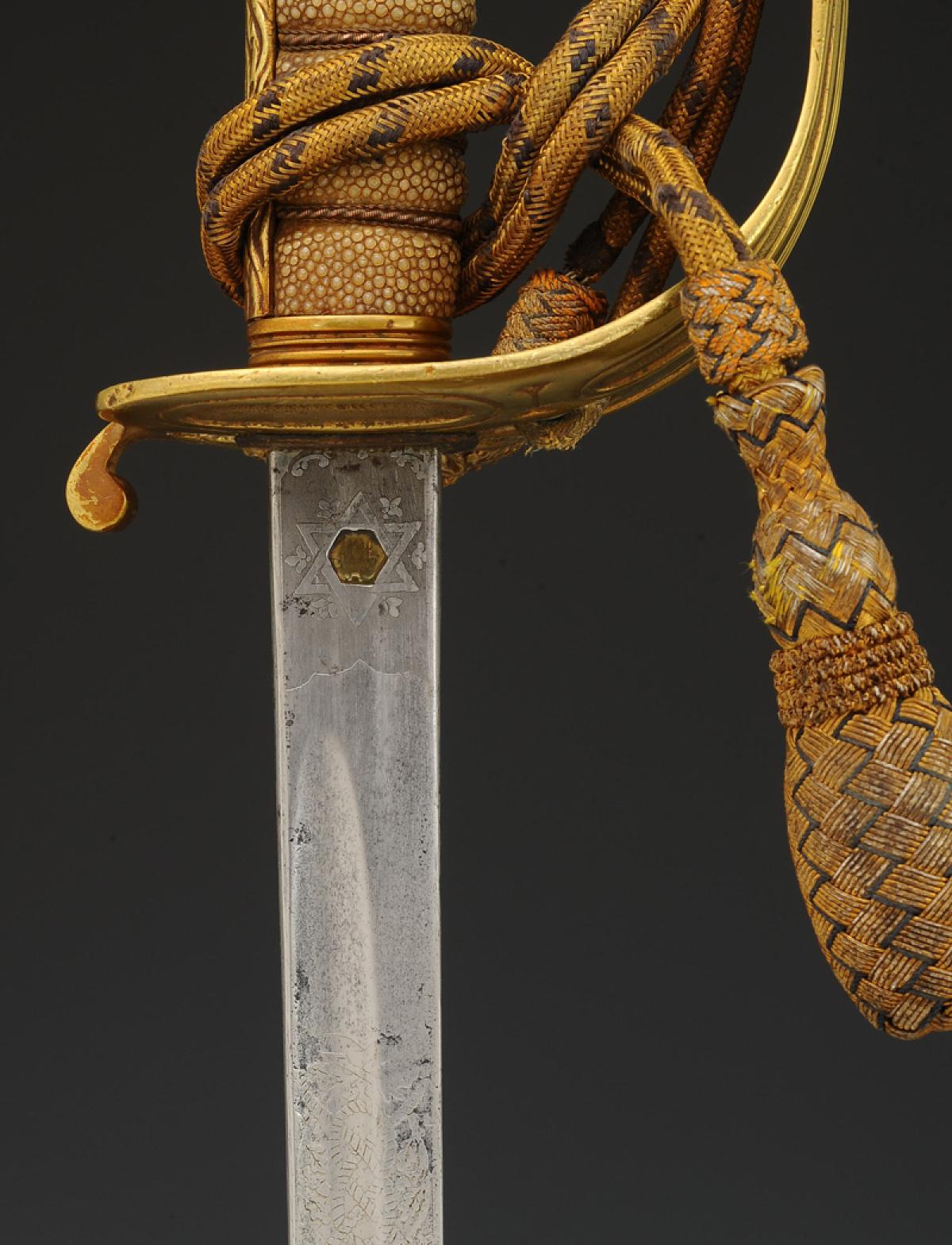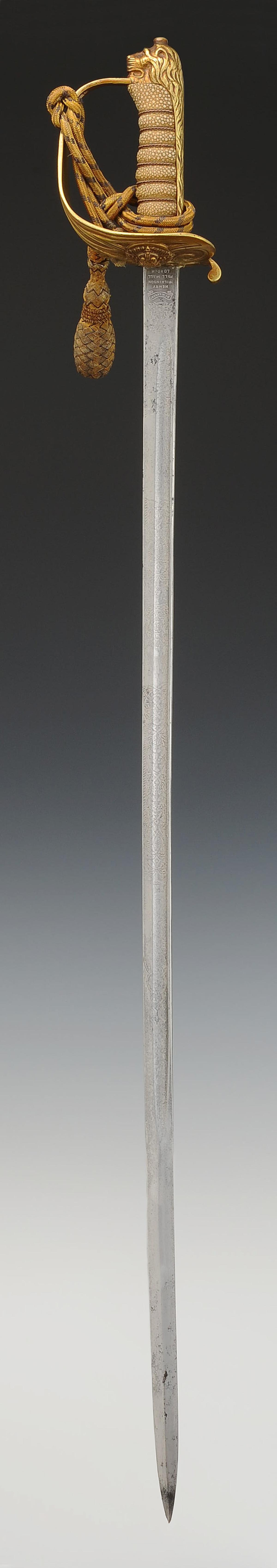 Monture en laiton. Garde à une large branche pleine décorée d'un médaillon moulé d'une ancre encablée couronnée sur fond d'une étoile perlée à soleil rayonnant. Calotte à longue queue en forme de tête de lion. Poignée en bois recouvert de galuchat blanc filigrané cuivre. Virole décorée aux traits. Cravate en cuir naturel. Lame droite à gouttières, longueur 81 cm, gravée sur ses deux tiers à l'acide sur chaque face : sur la face avant, signée au talon des armoiries Anglaises avec l'inscription « BY WARRANT / HENRY / WILKINSON / PALL MALL / LONDON » et gravée d'un décor végétal encadrant sur fond rayonnant les armoiries de l'Empire Indien (1) ; sur la face arrière au talon, une étoile à six branches, les initiales « R.I.M. » encadrant les armes de la marine indienne (étoile sur fond rayonnant). Dos de lame matriculé « 58094 ». Cravate en cuir naturel.