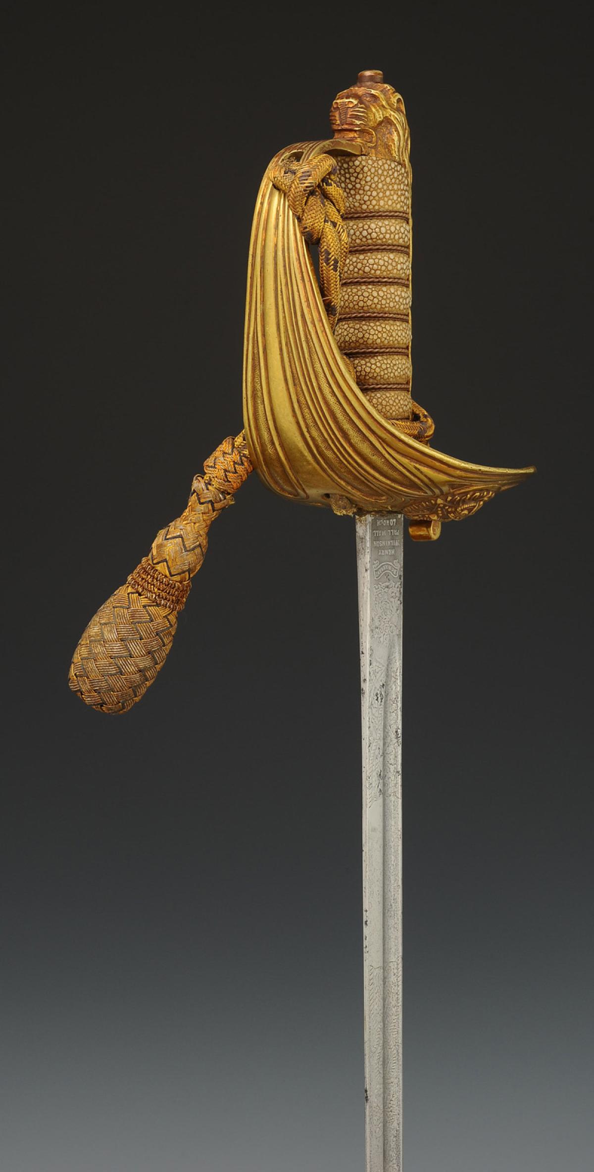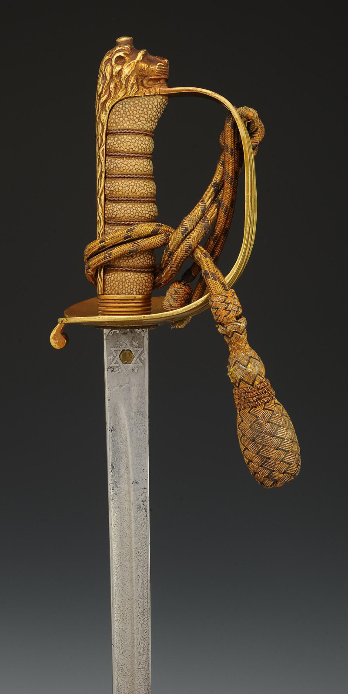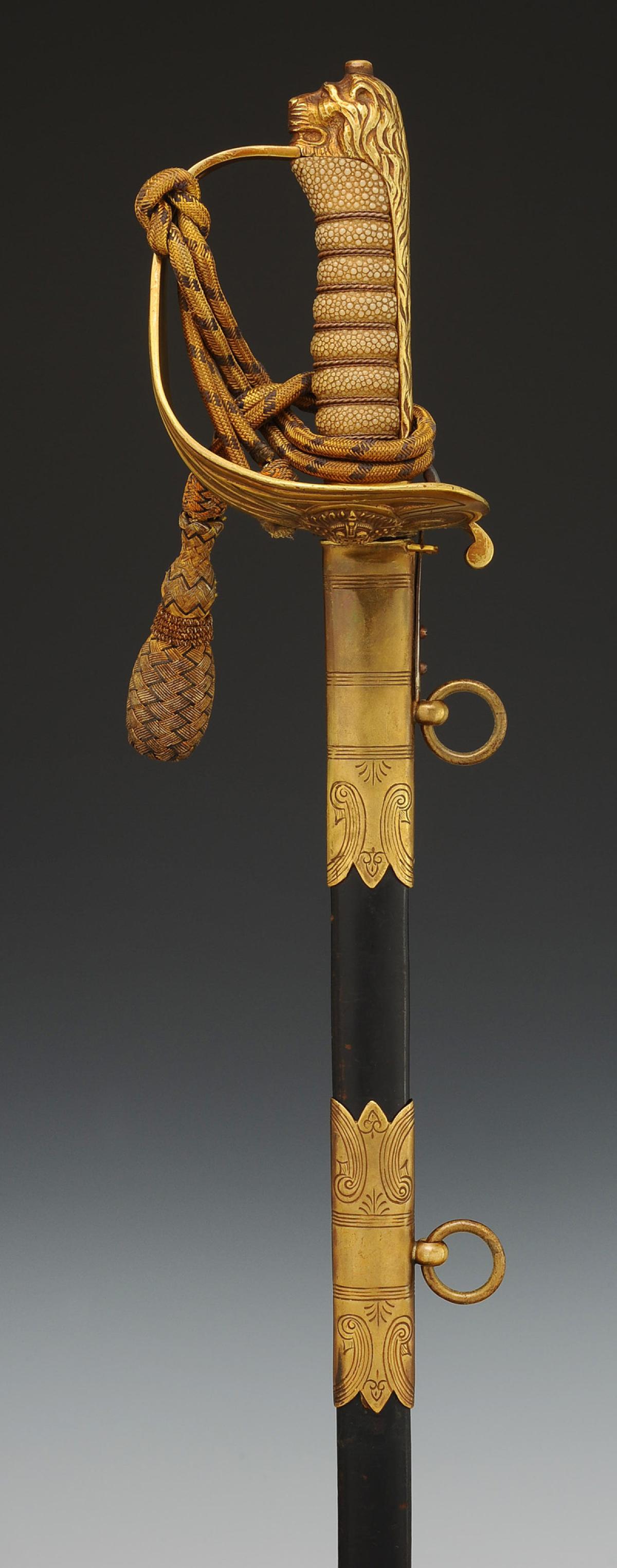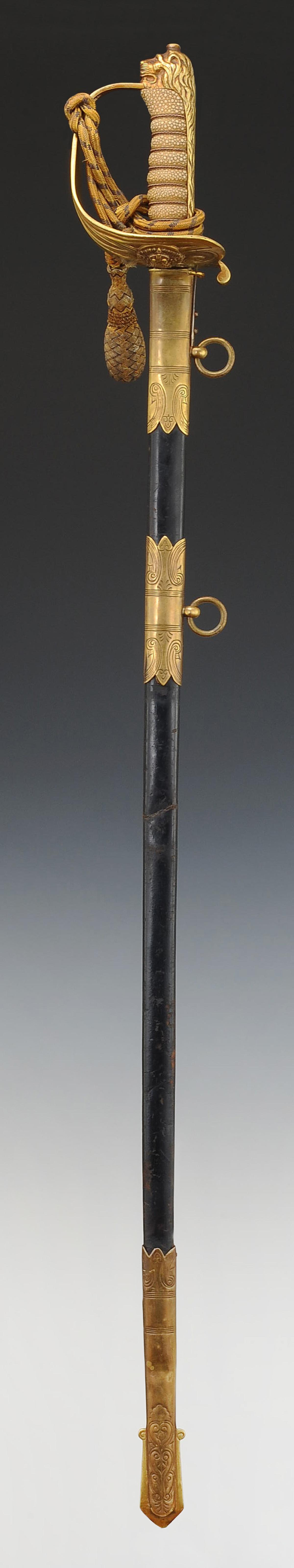Monture en laiton. Garde à une large branche pleine décorée d'un médaillon moulé d'une ancre encablée couronnée sur fond d'une étoile perlée à soleil rayonnant. Calotte à longue queue en forme de tête de lion. Poignée en bois recouvert de galuchat blanc filigrané cuivre. Virole décorée aux traits. Cravate en cuir naturel. Lame droite à gouttières, longueur 81 cm, gravée sur ses deux tiers à l'acide sur chaque face : sur la face avant, signée au talon des armoiries Anglaises avec l'inscription « BY WARRANT / HENRY / WILKINSON / PALL MALL / LONDON » et gravée d'un décor végétal encadrant sur fond rayonnant les armoiries de l'Empire Indien (1) ; sur la face arrière au talon, une étoile à six branches, les initiales « R.I.M. » encadrant les armes de la marine indienne (étoile sur fond rayonnant). Dos de lame matriculé « 58094 ». Cravate en cuir naturel.