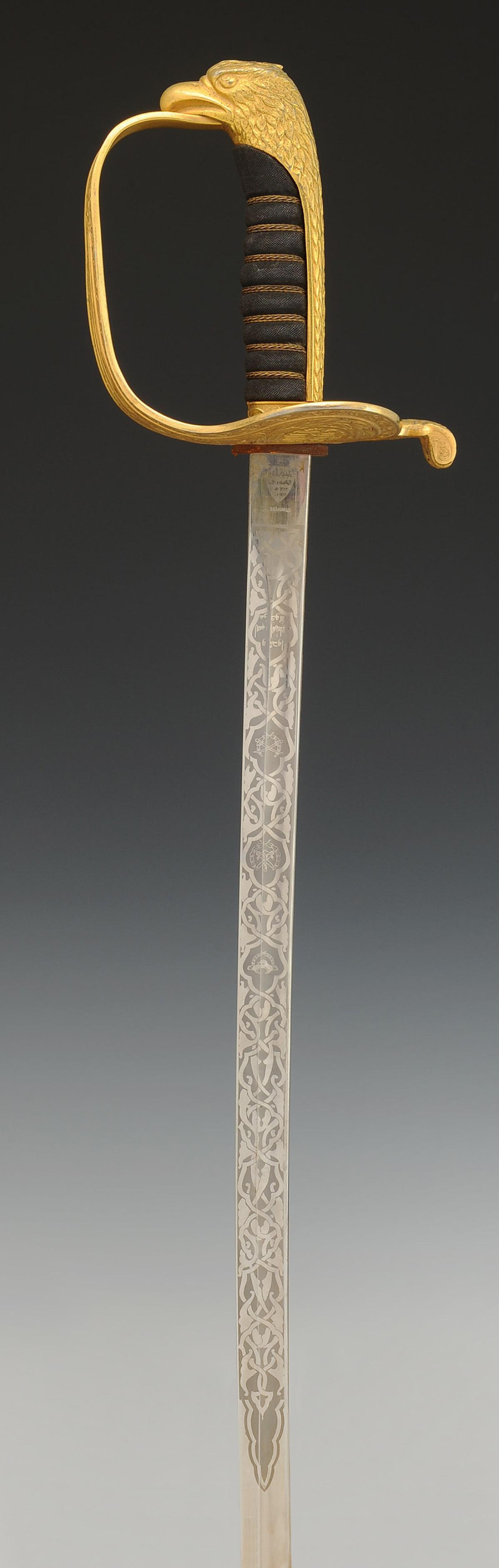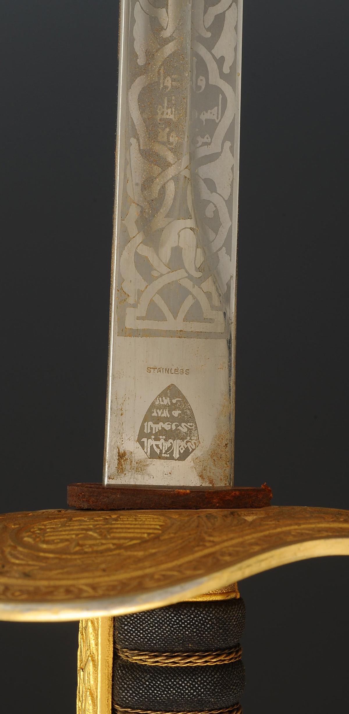 Monture en laiton doré. Garde à deux branches formant une coquille ajourée à l'avant représentant un médaillon rond avec inscription en langue syrienne encadrée de branches de laurier, contre garde ajourée d'une branche de laurier. Branche de garde bordée d'une moulure avec corolles de feuillages. Calotte à longue queue en forme de tête d'aigle. Poignée en bois noir finement quadrillé, filigrane en laiton. Virole décorée de corolles de feuillages. Cravate en buffle naturel. Lame très légèrement courbe à gouttières, longueur 76 cm, nickelée. Sur la face avant au talon, poinçonnée « STAINLESS » ainsi que d'un écu avec inscription en langue syrienne ; sur les deux tiers, un décor géométrique entrelacé avec des cartouches portant : inscription en langue syrienne, symbole de l'armée de terre, symbole de la marine et symbole de l'armée de l'air. La face arrière pareillement décorée à la face avant, à l'exception de la signature du talon de lame qui ici est « WKC / SOLINGEN / GERMANY » (Weyesberg Kirschbaum & Cie).